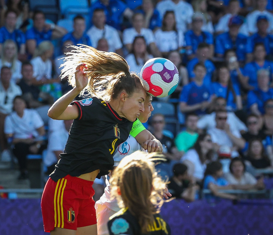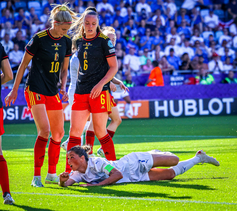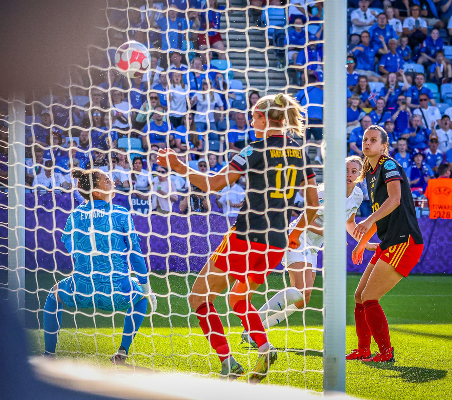 Besta leikflétta Belgíu í leiknum endar með því að Dhont fær boltann í teignum en blessunarlega fyrir Ísland þá hittir hún boltann illa og boltinn fer framhjá.