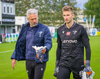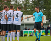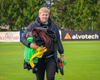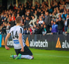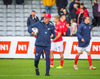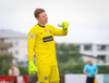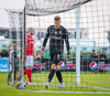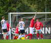 Frederik sér við honum, ver boltann í innkast og fagnar vel.