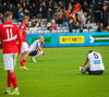Haukur liggur eftir og fær aðhlynningu, vonandi getur hann haldið leik áfram!