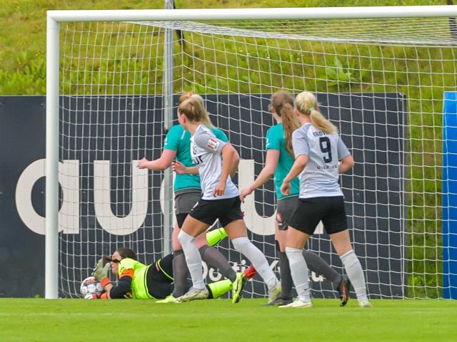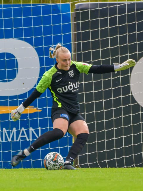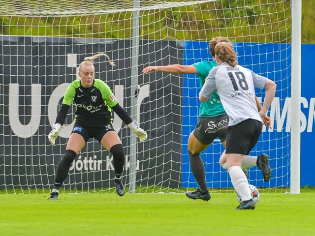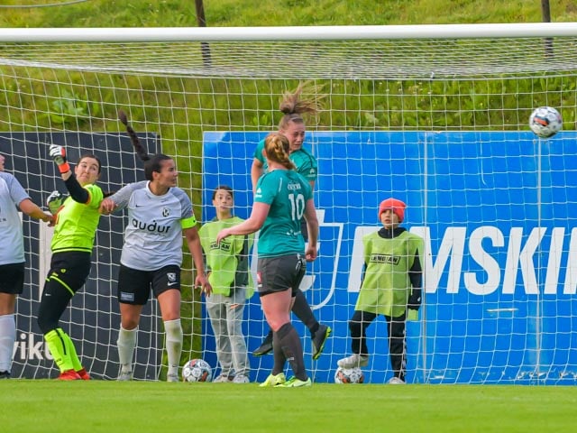 Rannveig með góða fyrirgjöf á hausinn á Vigdíssi sem skallar boltann í fangið á Anne í markinu.