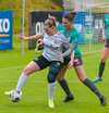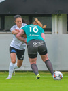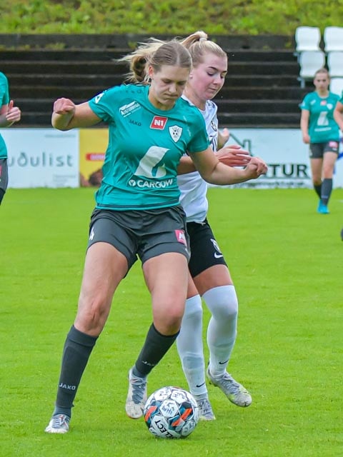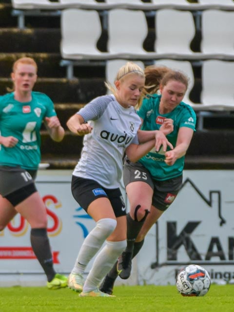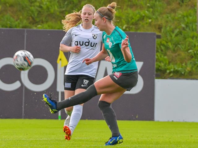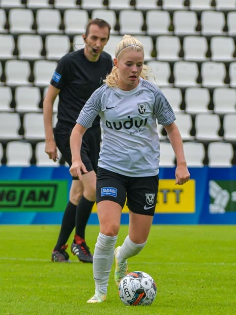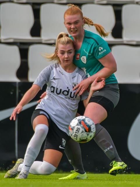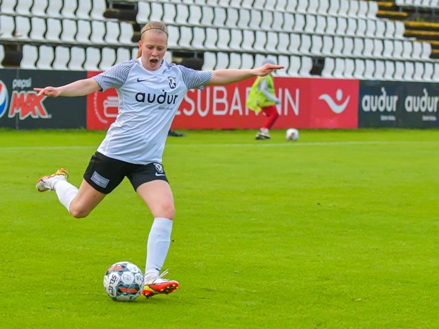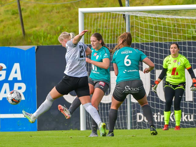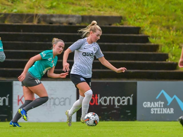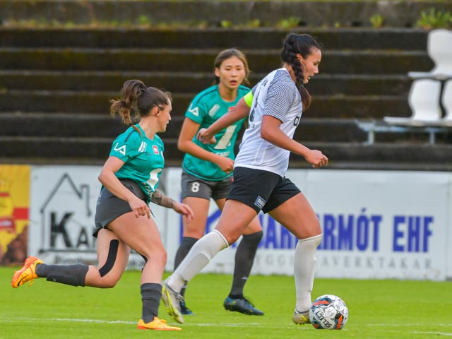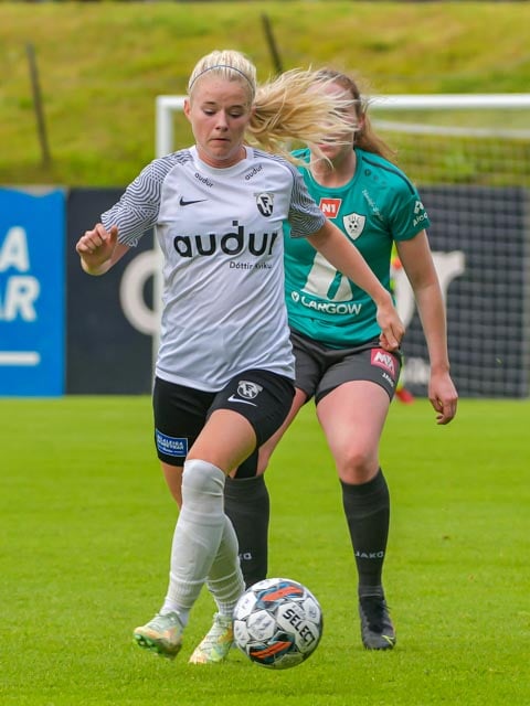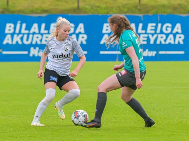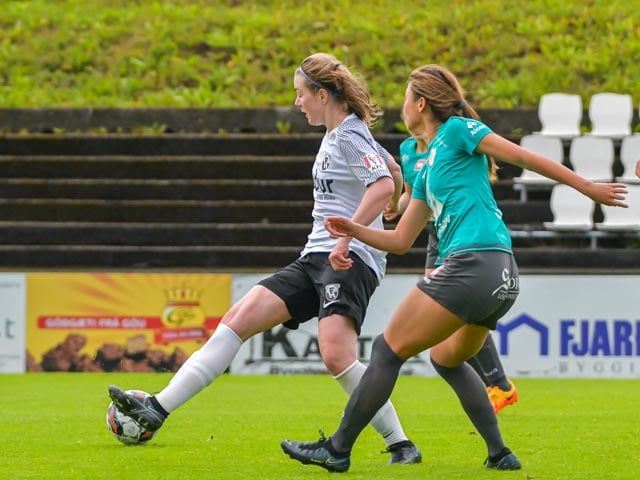 Rannveig ferir vel í að halda boltanum inn á við endalínuna og er við það að koma sér fram hjá Rósey en Rósey gerir vel, nær Rannveigu og kemur boltanum frá.