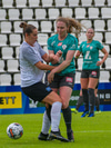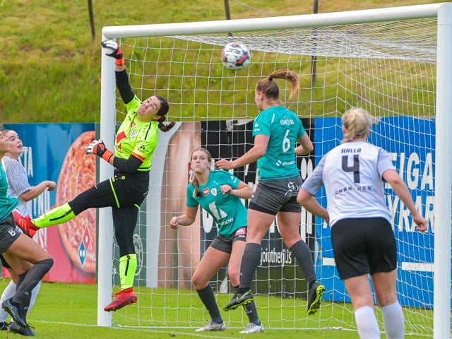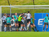Bayleigh vinnur boltann aftur af Esher á vallarhelmingi F/H/L og á núna sendingu upp í horn ætlaða Ainhoa, en Halla vinnu kapphlaupið við Ainhoa og kemur boltanum frá.