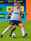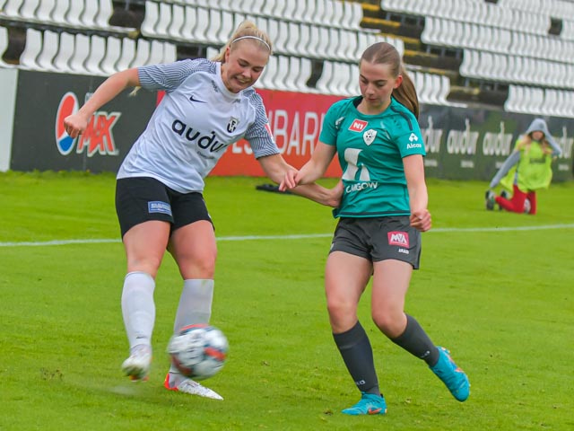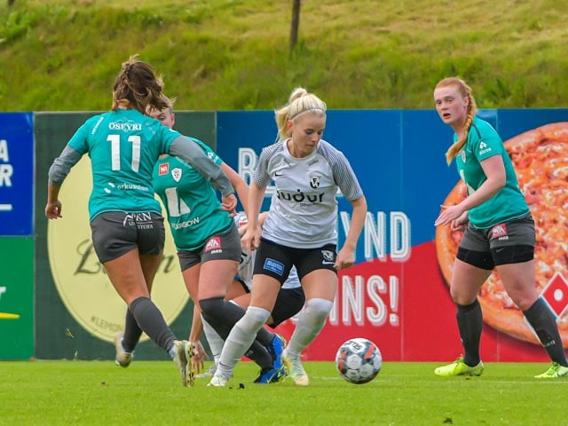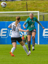 Sunneva fer illa með Bjarndísi á hægri kantinum, vippar boltanu vintra meginn fram hjá henni, hleypur hægra megin við hana, nær boltanum og setur boltann fyrir en Rósey kemur boltanum frá.