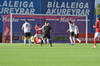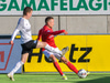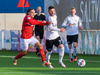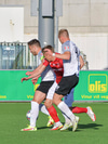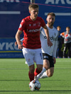 Haukur Páll kemur á ferðinni og reynir að tækla boltann en er of seinn og fer í Björn Daníel og Erlendur færir Hauk til bókar hér.