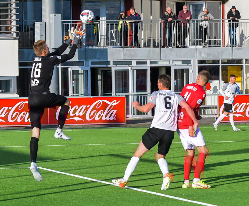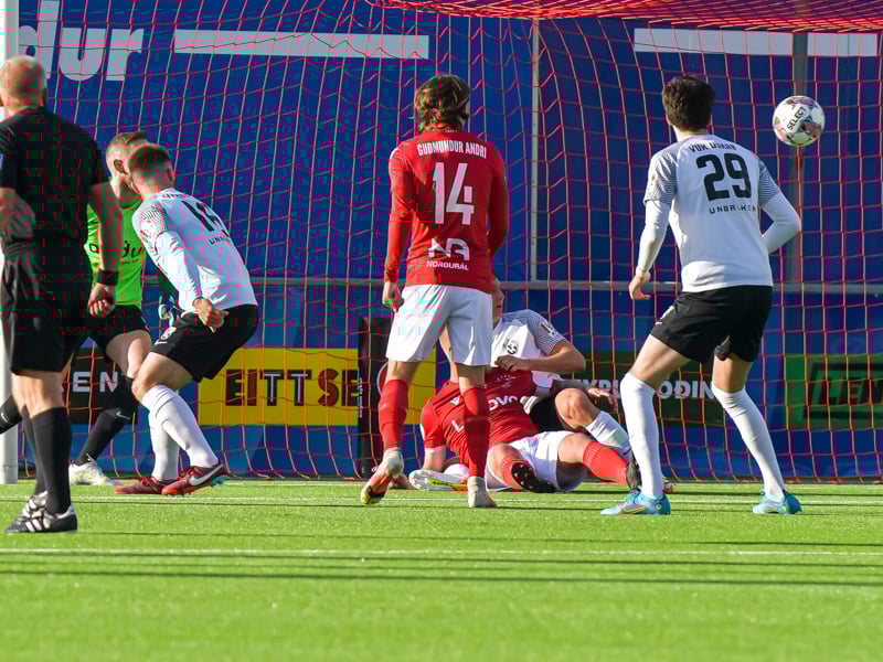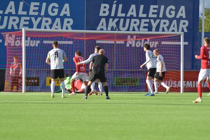 Haraldur Einar lyftir boltanum inn á teiginn og boltinn dettur fyrir fætur Kidda sem rennir honum til hliðar í hlaup á Oliver Heiðarsson sem kemur með góðan bolta á Matta en Schram ver.