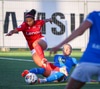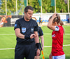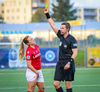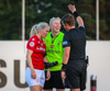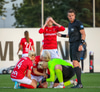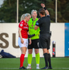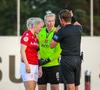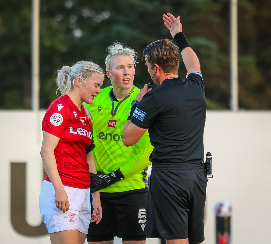 Arna Sif liggur eftir á vellinum. Katrín tók heldur harkalega á henni en ekkert var dæmt. Sandra markvörður er menntaður sjúkraþjálfari og fer í það að kíkja á Örnu Sif á meðan Ásta Árnadóttir, sjúkraþjálfari liðsins, fylgist með af hliðarlínunni. Eftir stutta stund stendur Arna Sif upp að nýju, klár í að halda áfram leik.