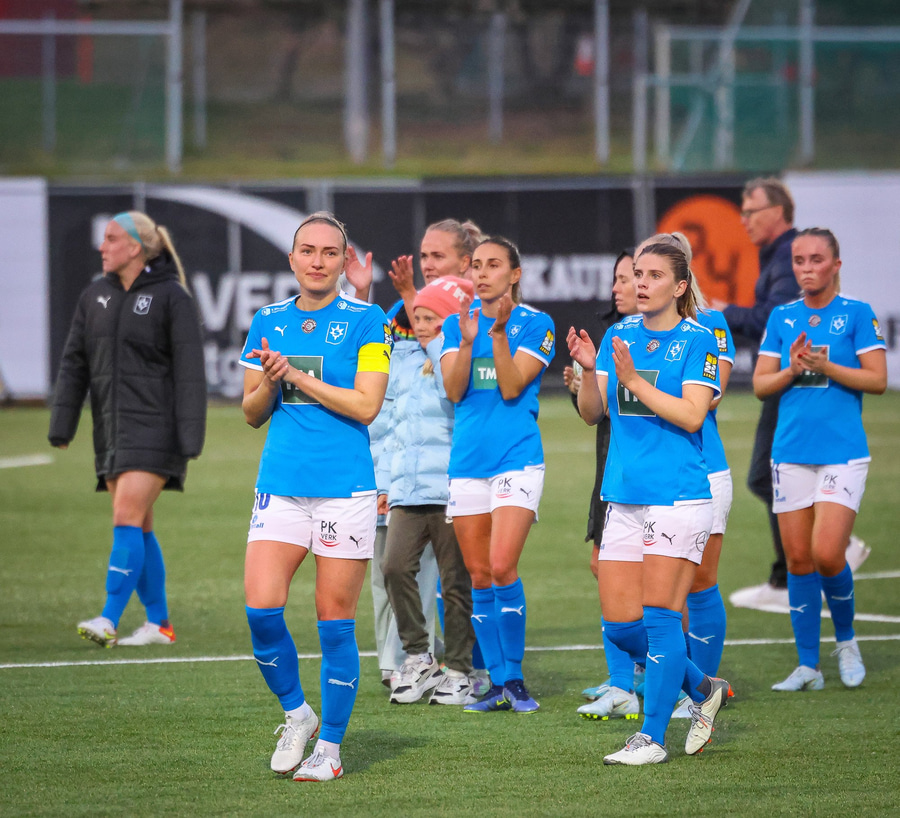 Leikurinn er hafinn. Það er Katrín Ásbjörns sem sparkar þessu í gang fyrir bláklæddar heimakonur.