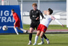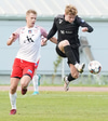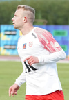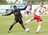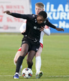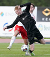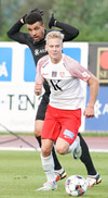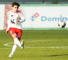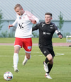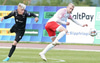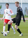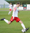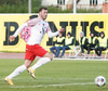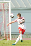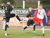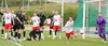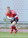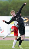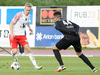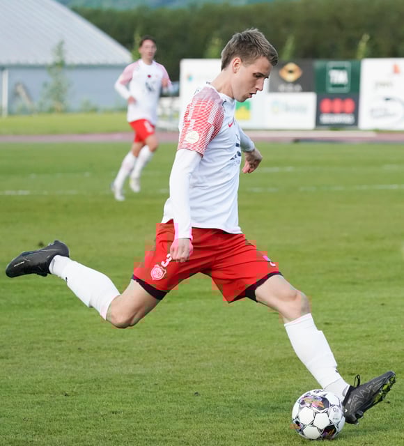 Sending fyrir, Oliver Horitz þarf að fara út í teiginn til að sækja boltann, hann tekur skotið í litlu jafnvægi og setur boltann hátt yfir.