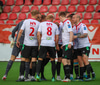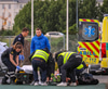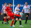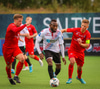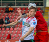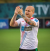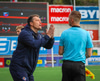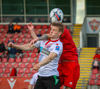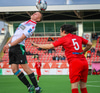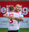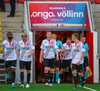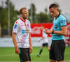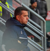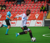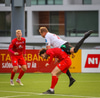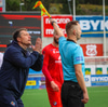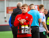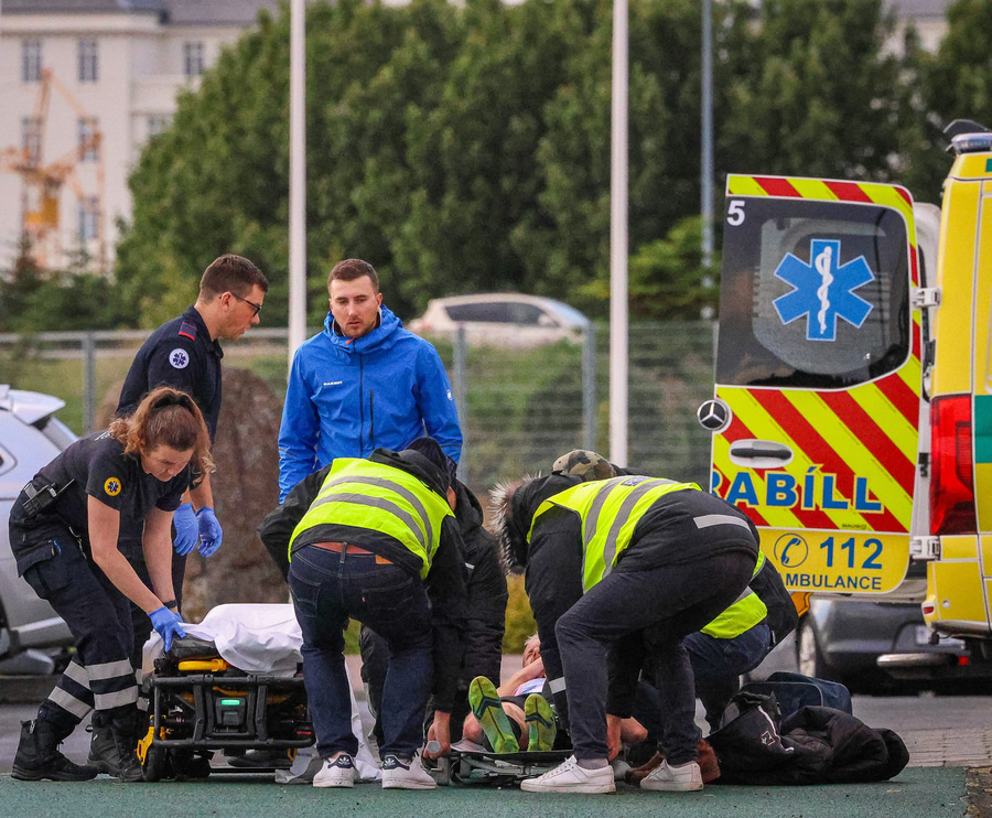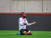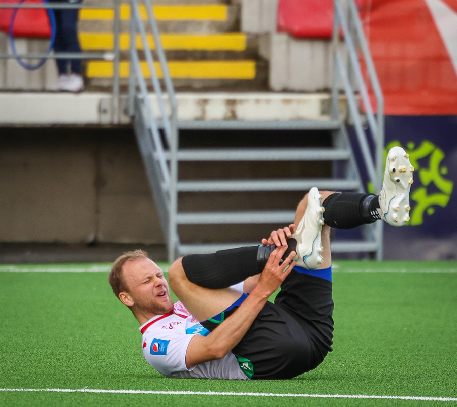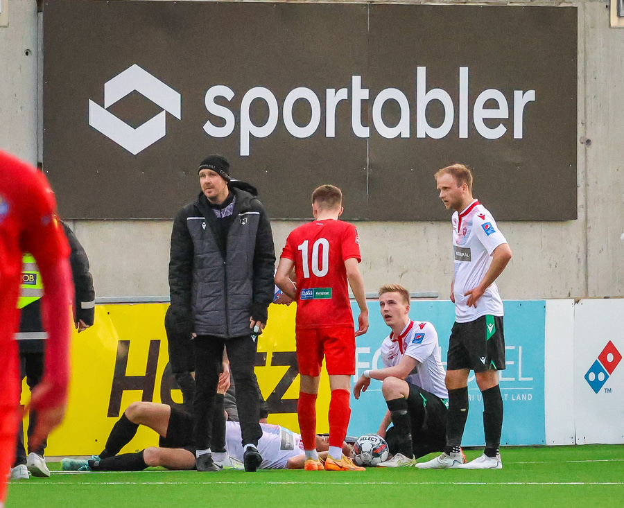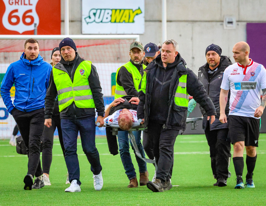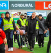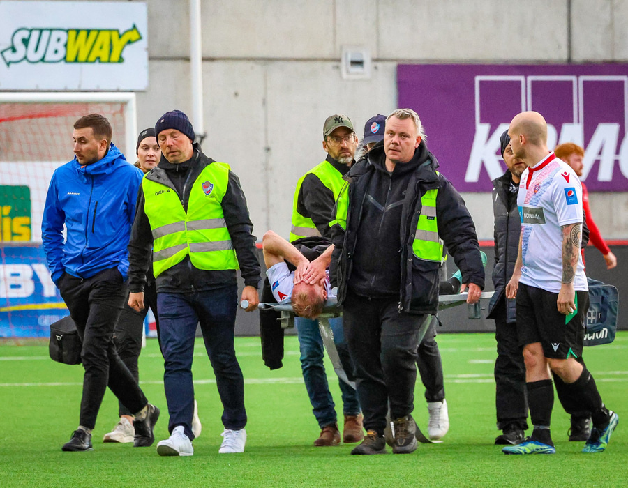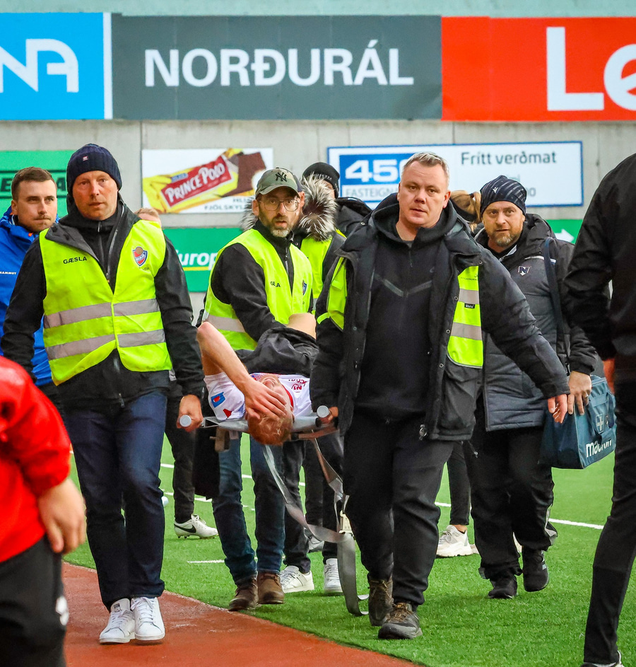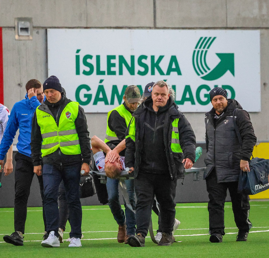 Leikurinn stopp. Kenneth Hogg er hérna eitthvað mjög illa meiddur. Börurnar komnar inn og miðað við viðbrögð leikmanna lítur þetta mjög illa út.
