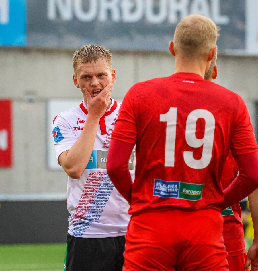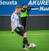 Gísli Þröstur Kristjánsson með skot naumlega framhjá. Þarna hefði Haukar getað tekið forystuna. Heimamenn fá svo tvær hornspyrnur í röð.