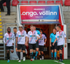 Liðin ganga hér inn á völlinn og Njarðvíkingar eru í hvítum varatreyjum Valsmanna.