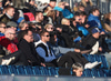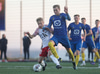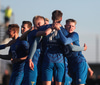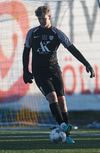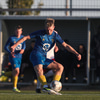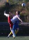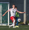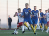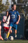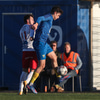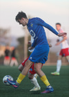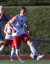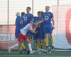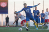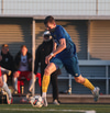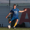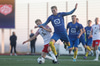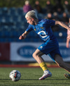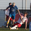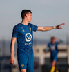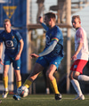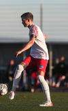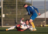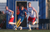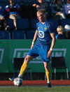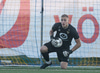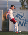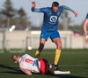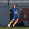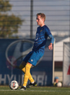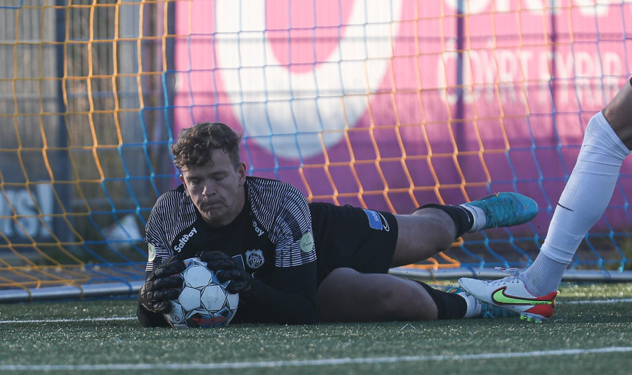 Kjartan með spyrnu beint á Auðunn í markinu. Boltinn skoppar af Auðunni, en hann nær svo í boltann eftir á.