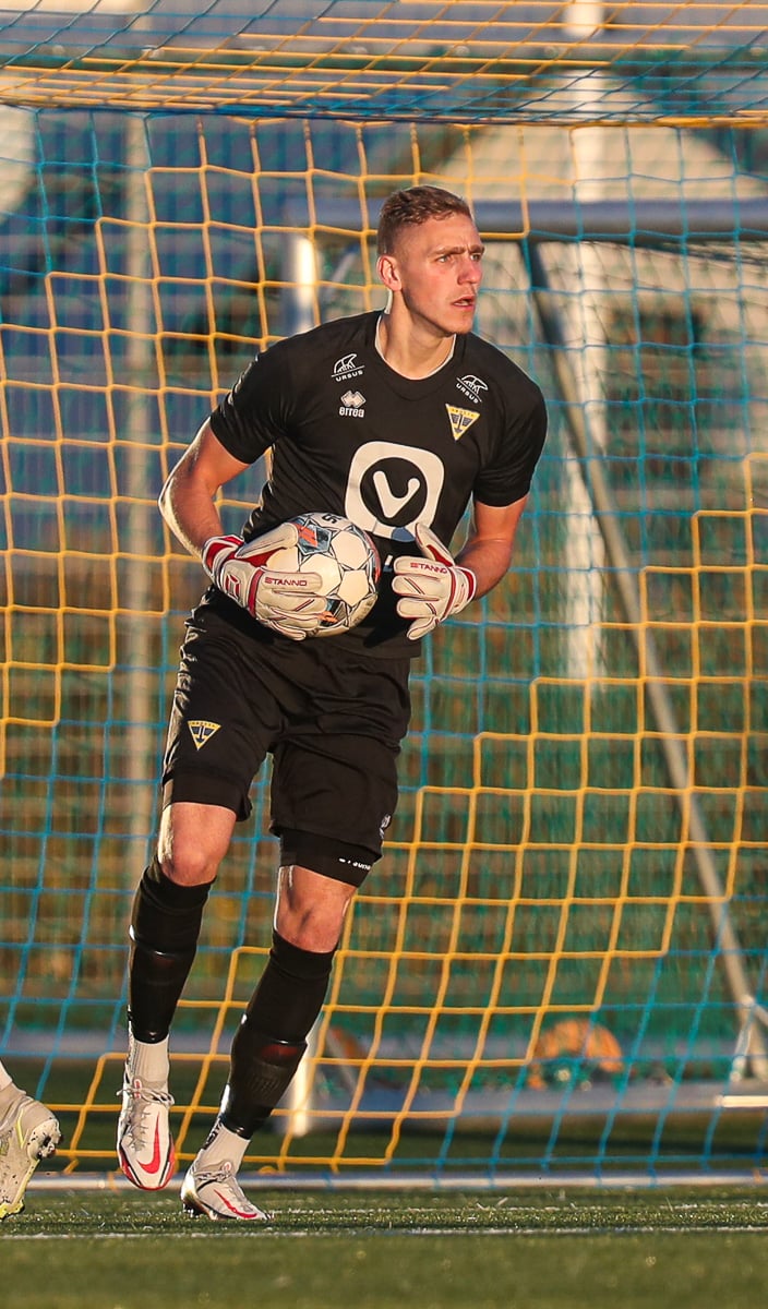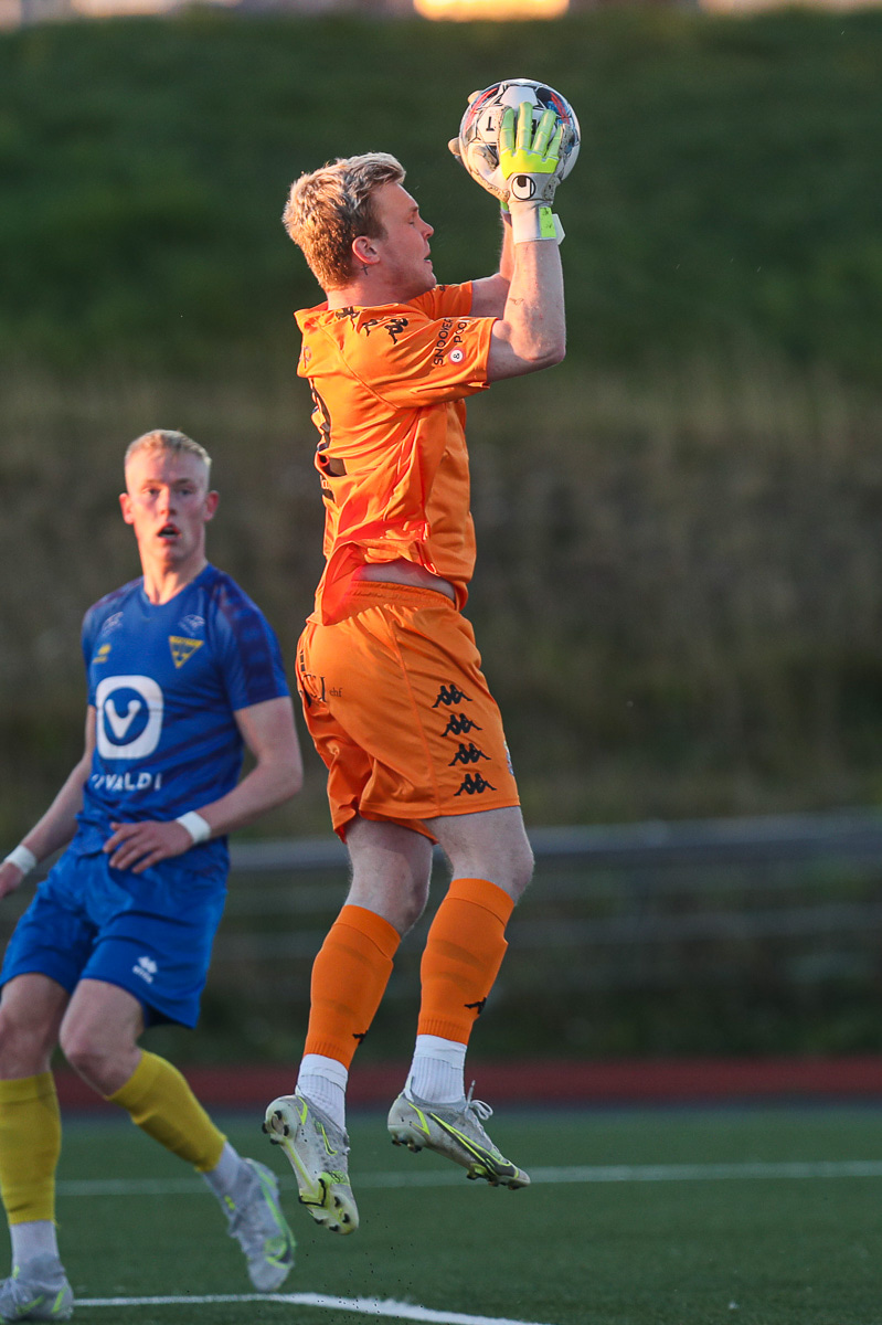 Oliver með spyrnu inn í teiginn sem Daði Freyr grípur í loftinu.