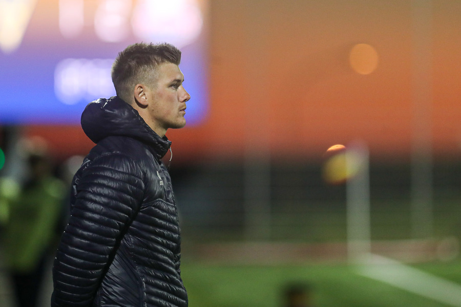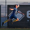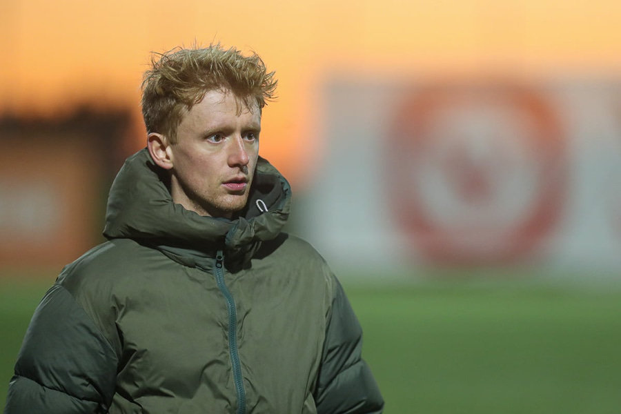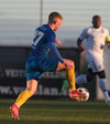 Leimaður Kórdrengja sparka boltanum út sem Luke nær í. Hann tekur svo skot sem fer yfir markið.