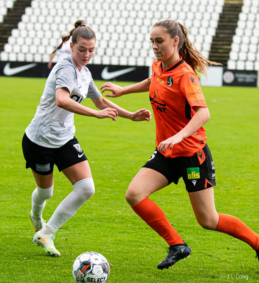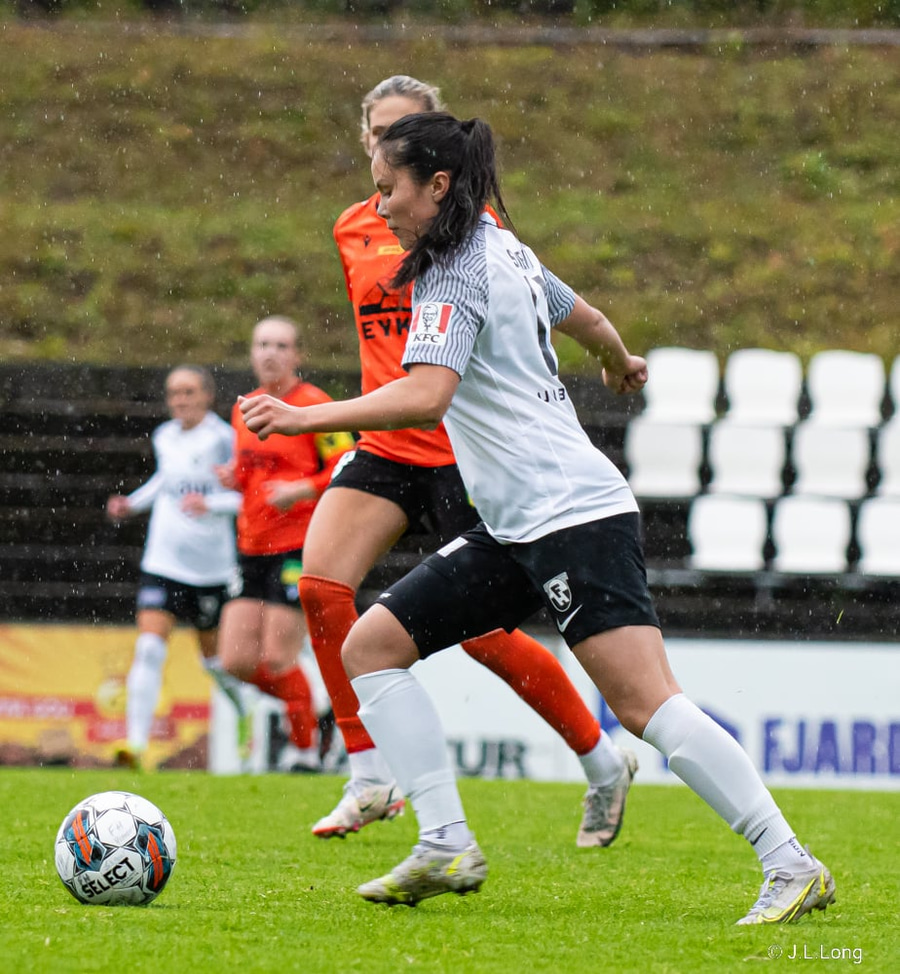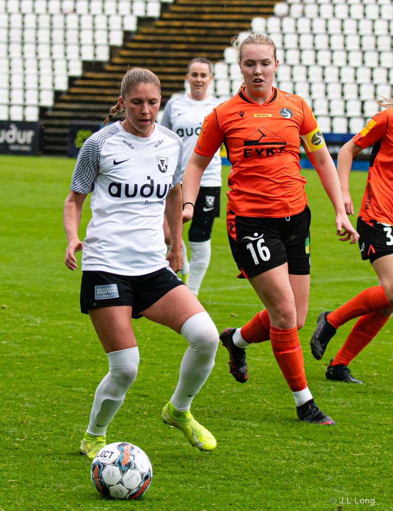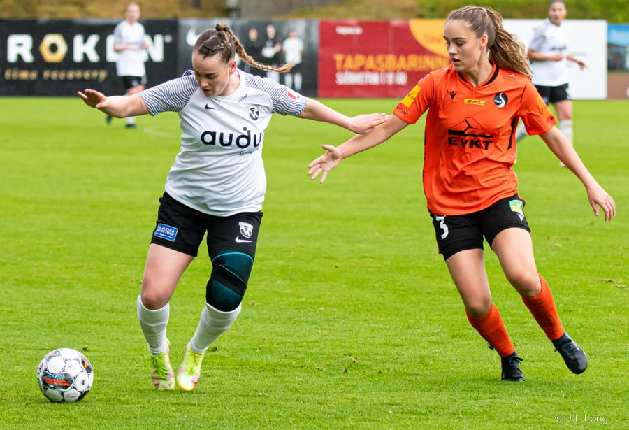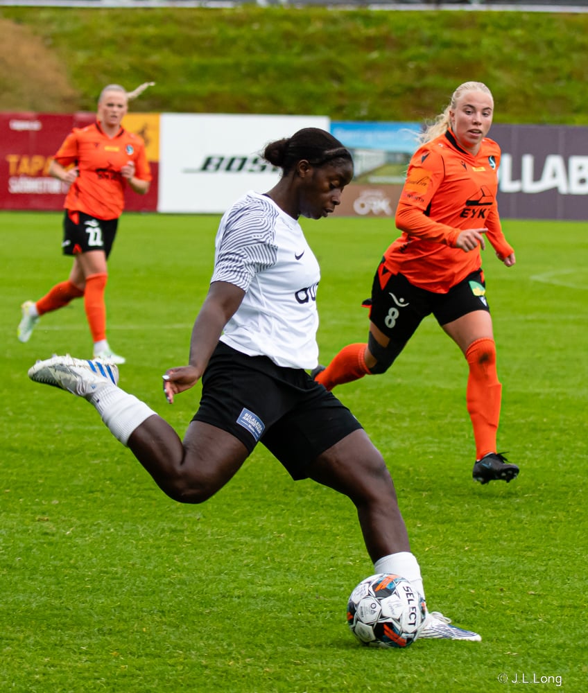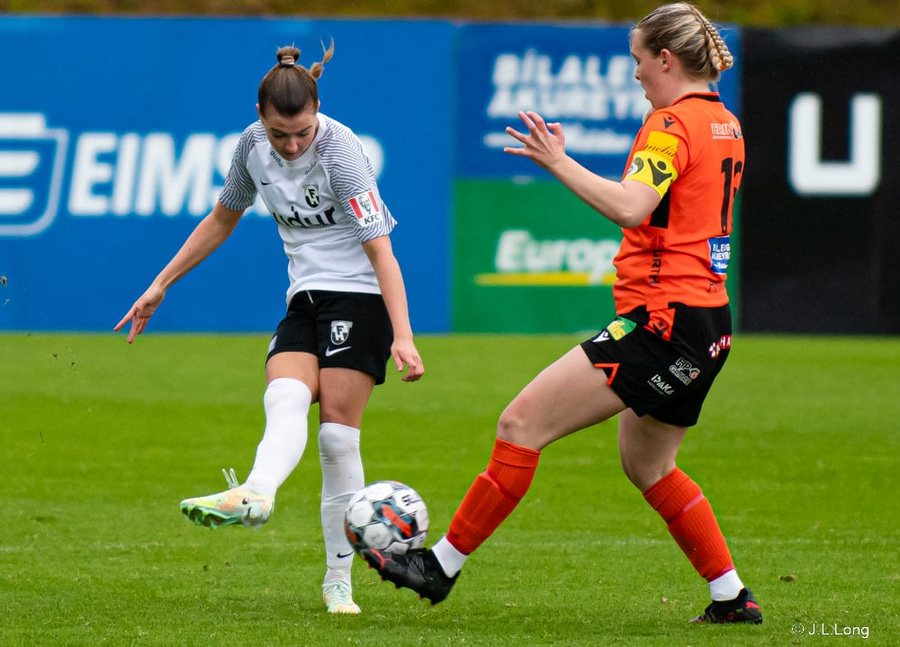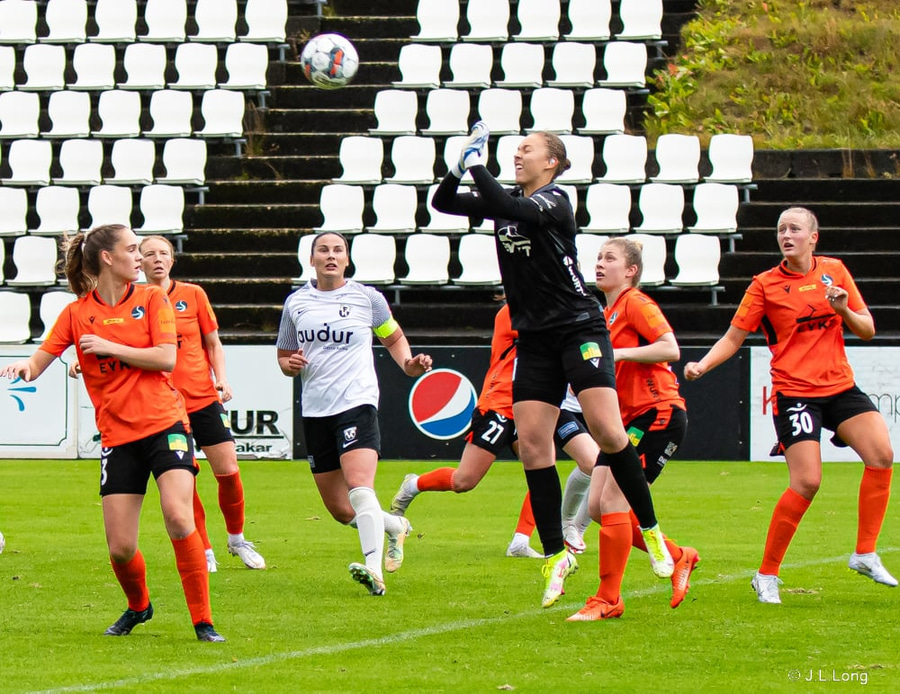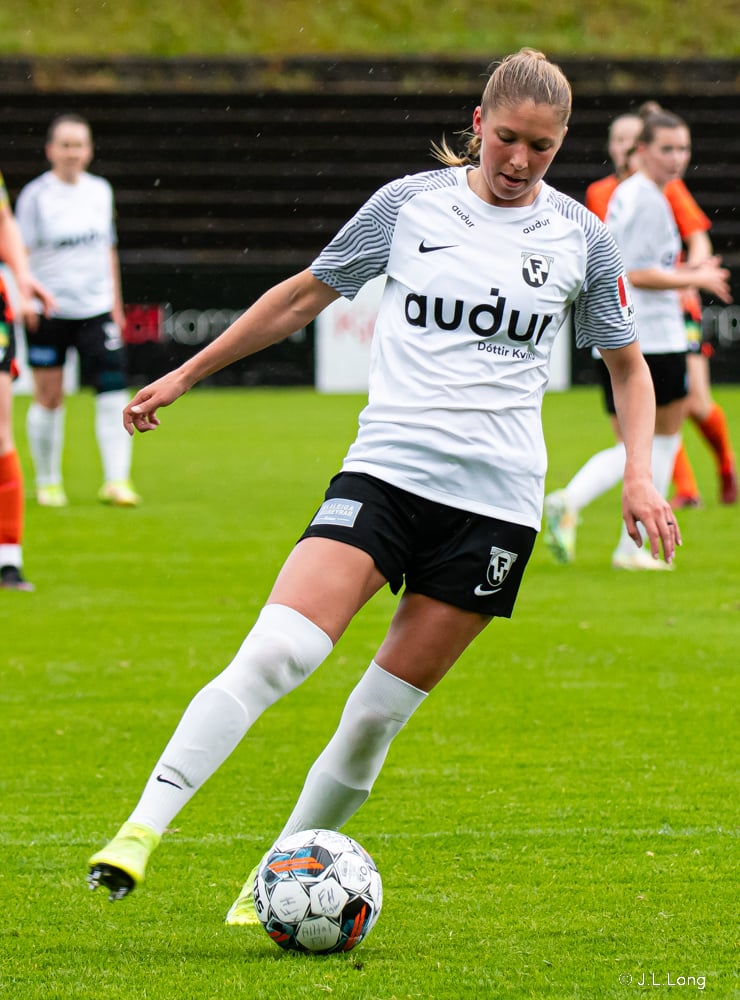 Flott tilraun hjá Evu, skot langt utan af velli rétt yfir markið, góð löpp á henni