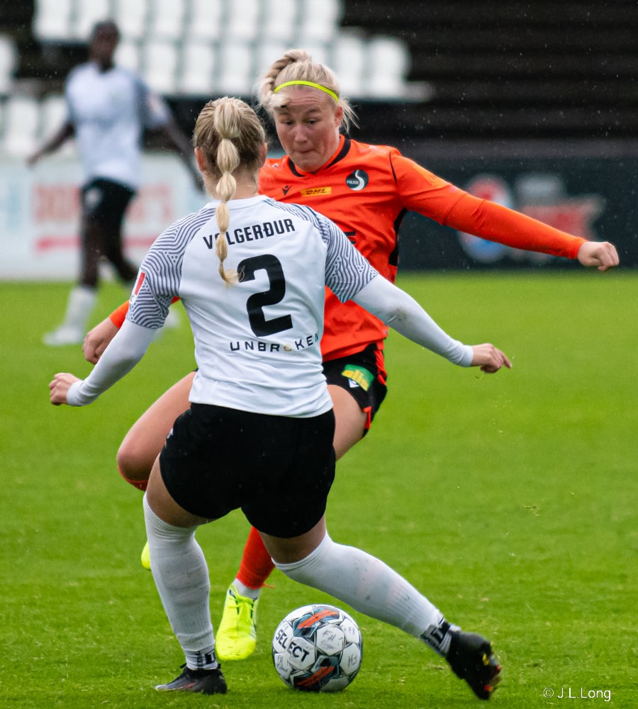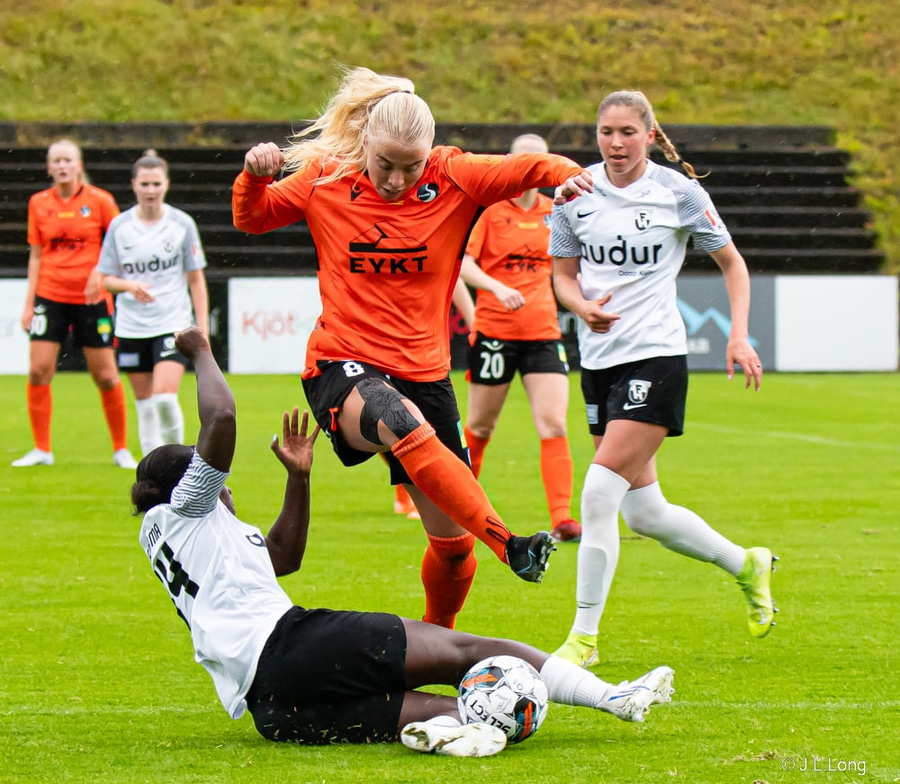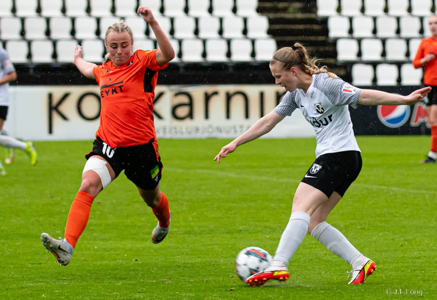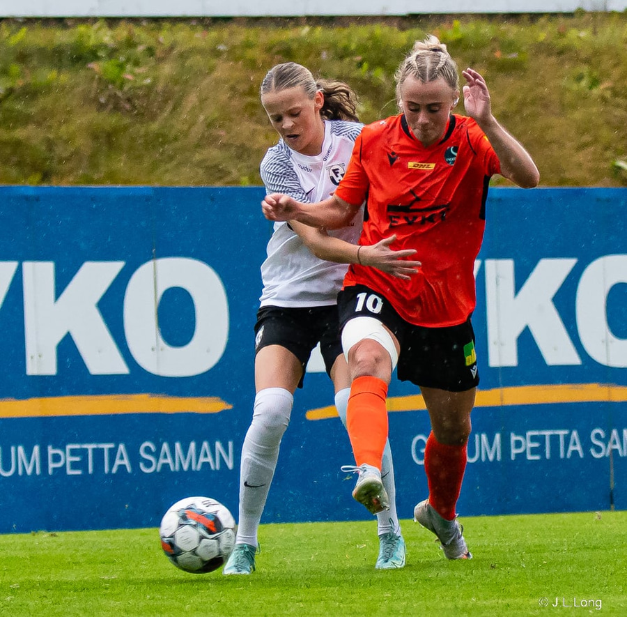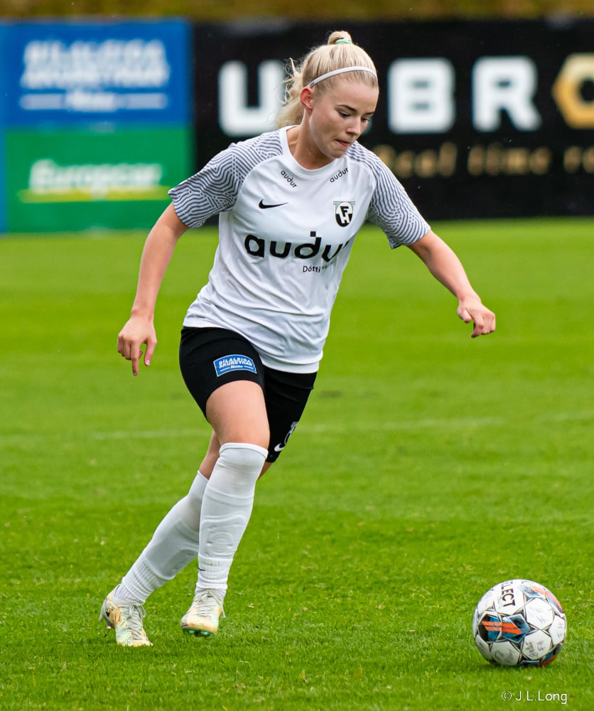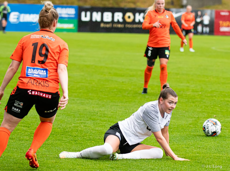 Hulda með frábæra sendingu á Helgu sem nær ekki nógu góðri snertinu, Aldís tæklar boltann útaf, þarna munaði ekki miklu að gott færi skapaðist
