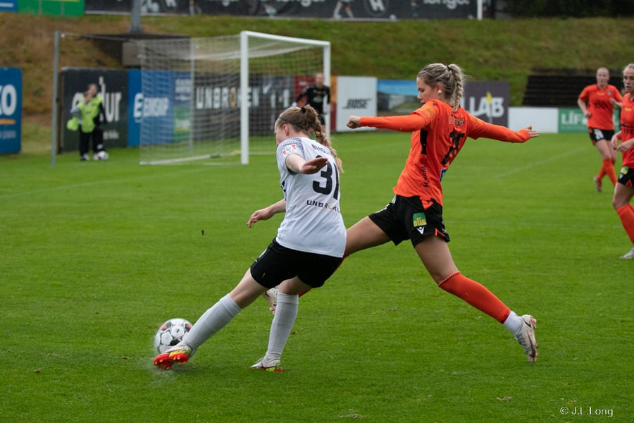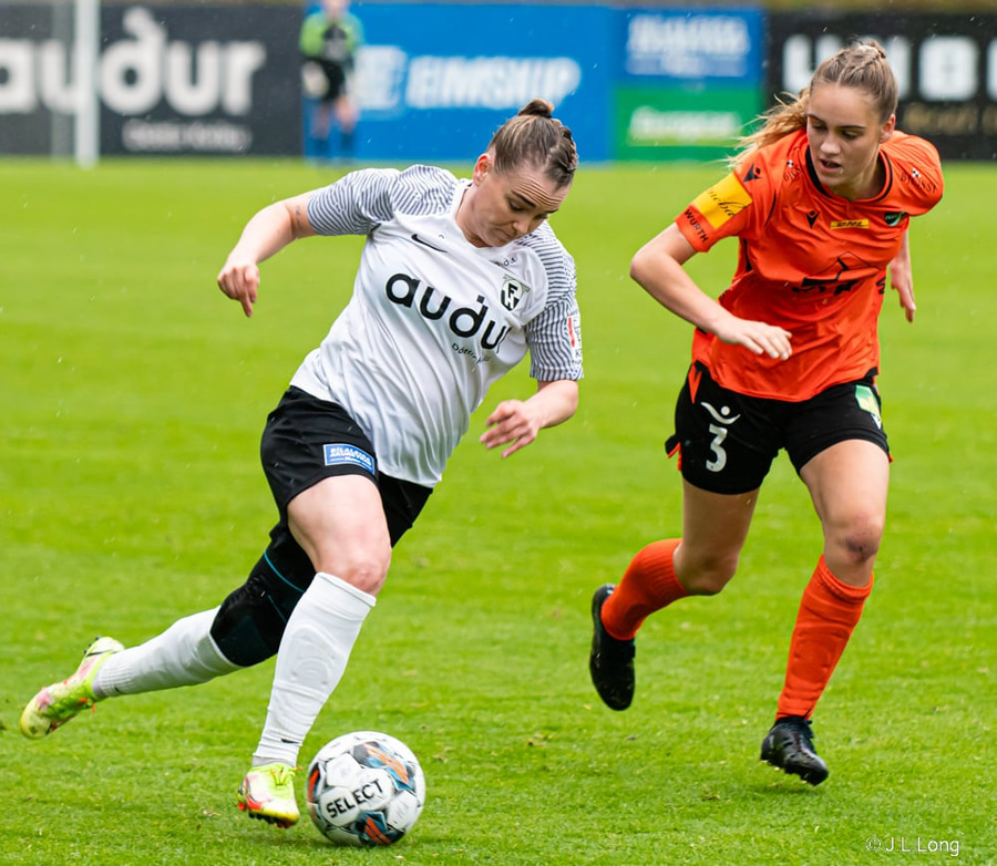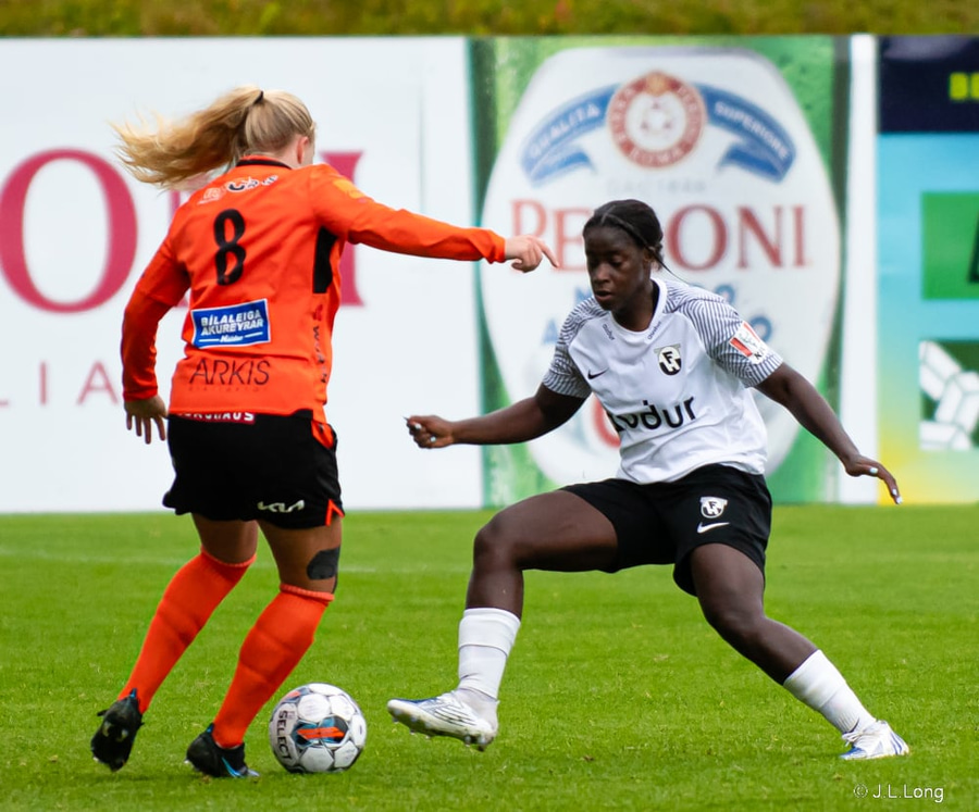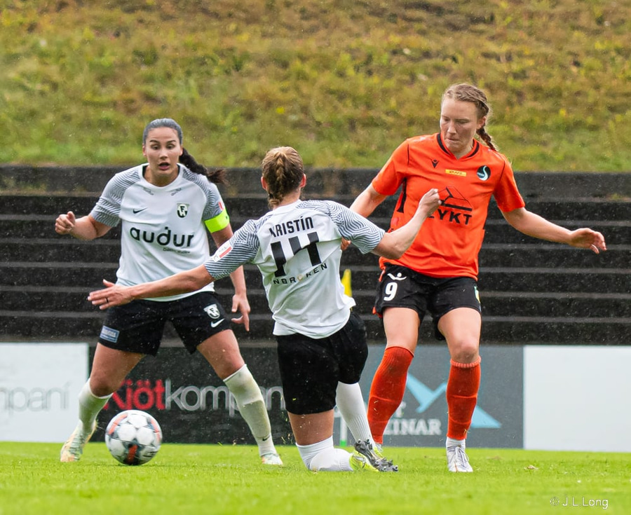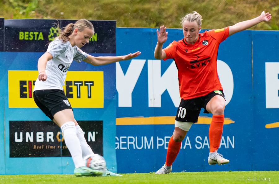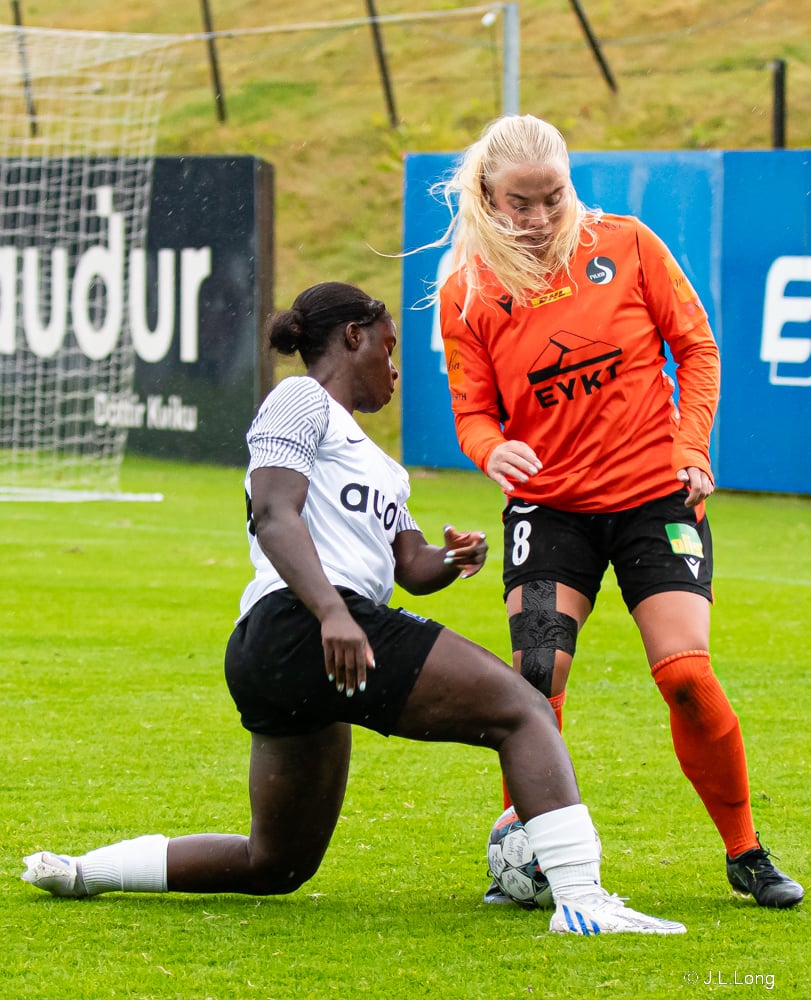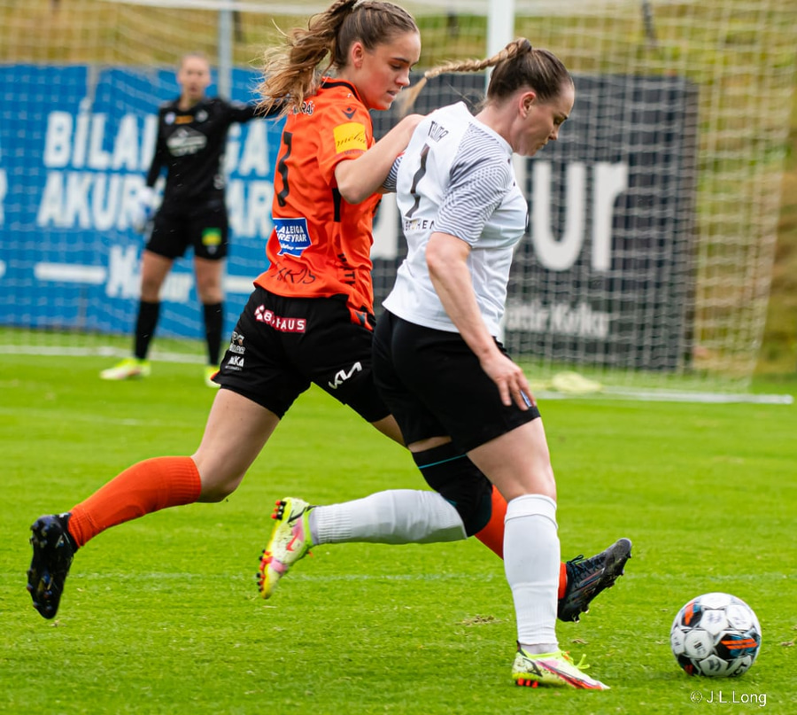 Hulda með frábæra sendingu á Helgu sem nær ekki nógu góðri snertinu, Aldís tæklar boltann útaf, þarna munaði ekki miklu að gott færi skapaðist