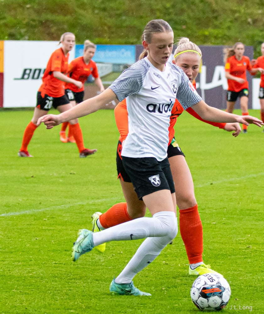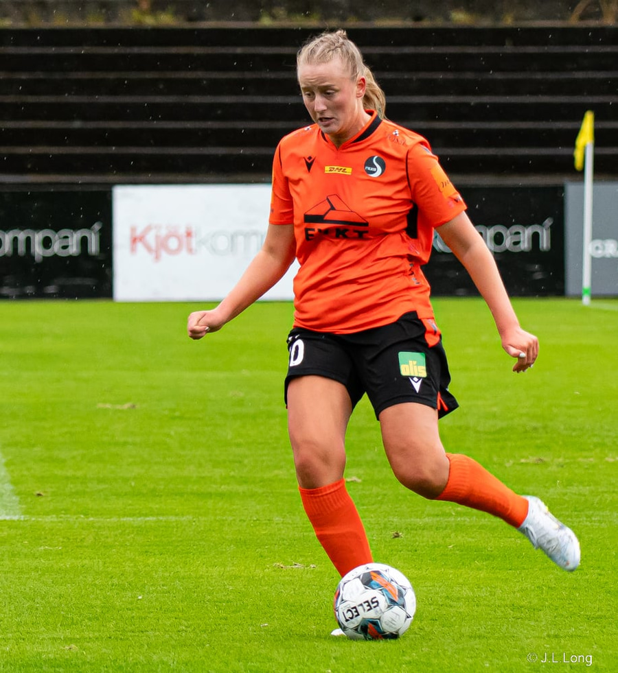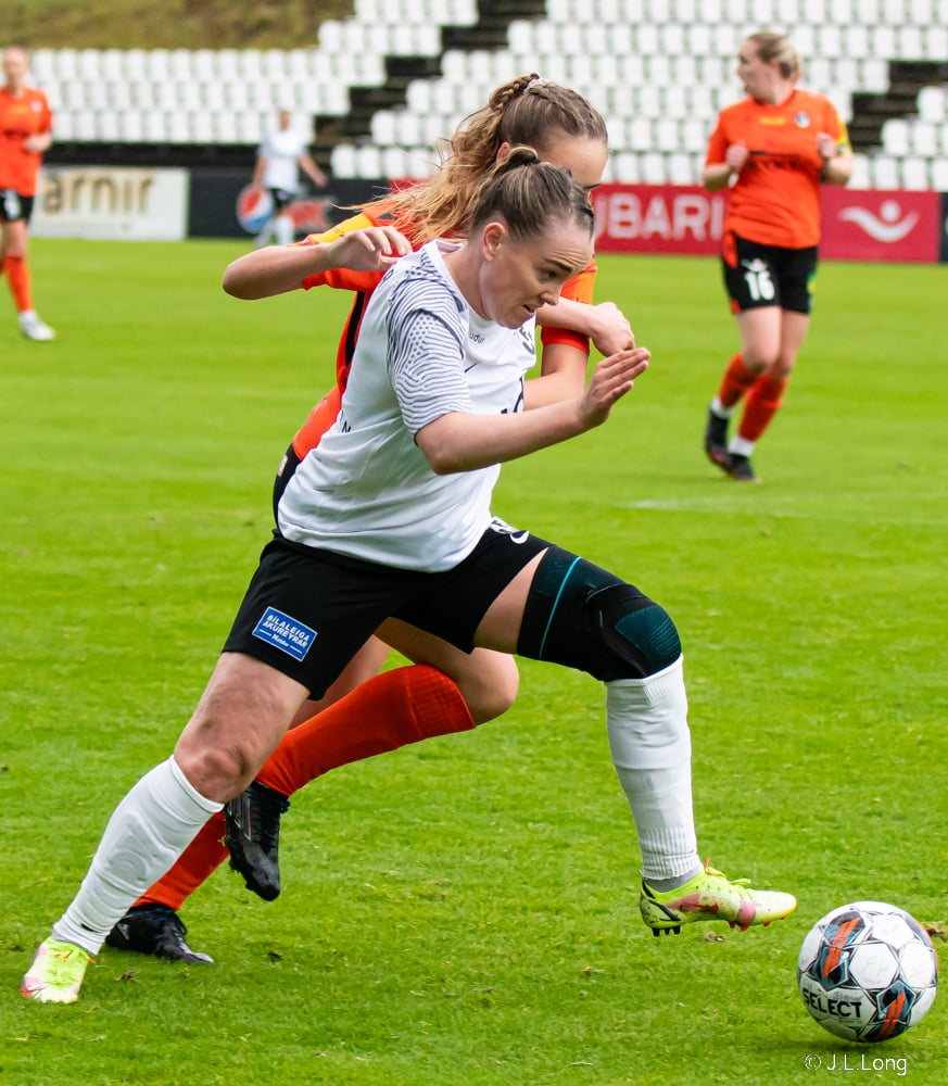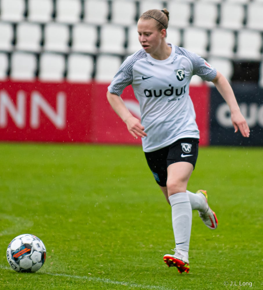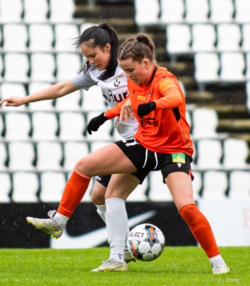 Hulda með frábæra sendingu á Helgu sem nær ekki nógu góðri snertinu, Aldís tæklar boltann útaf, þarna munaði ekki miklu að gott færi skapaðist