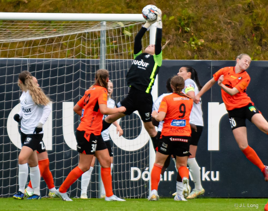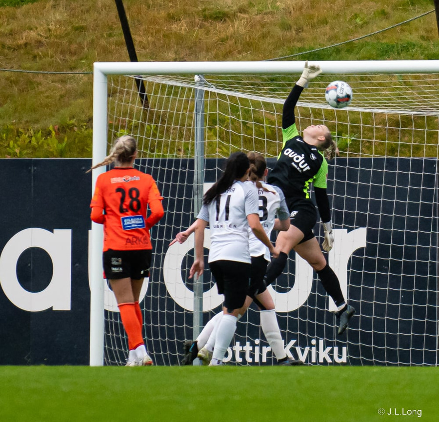 Fyrst Elísa en Tinna ver og slær boltann út þar sem