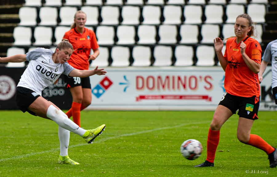 Telma í góðu færi í teignum en skotið vel framhjá, þetta var gott færi. Hefði átt að skjóta með vinstri þarna í staðinn fyrir utanfótar hægri