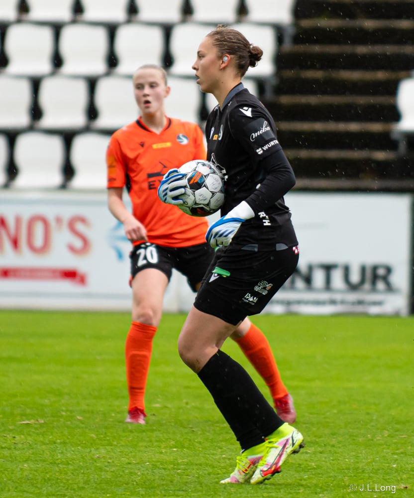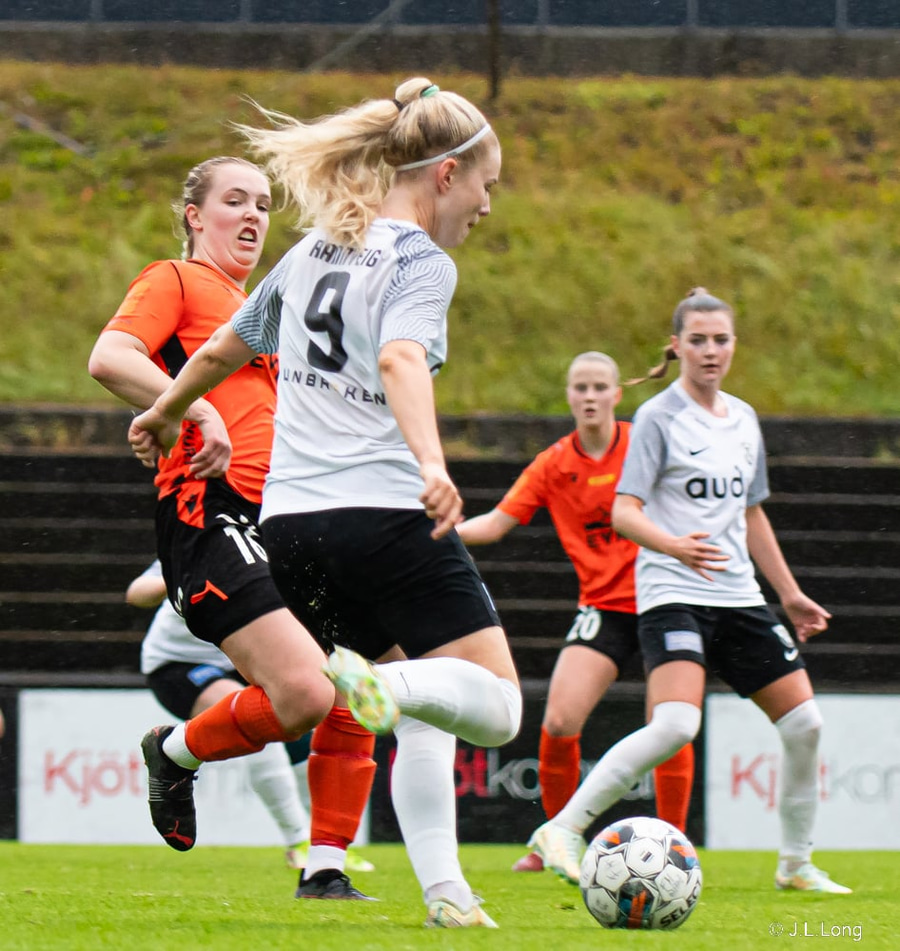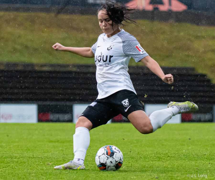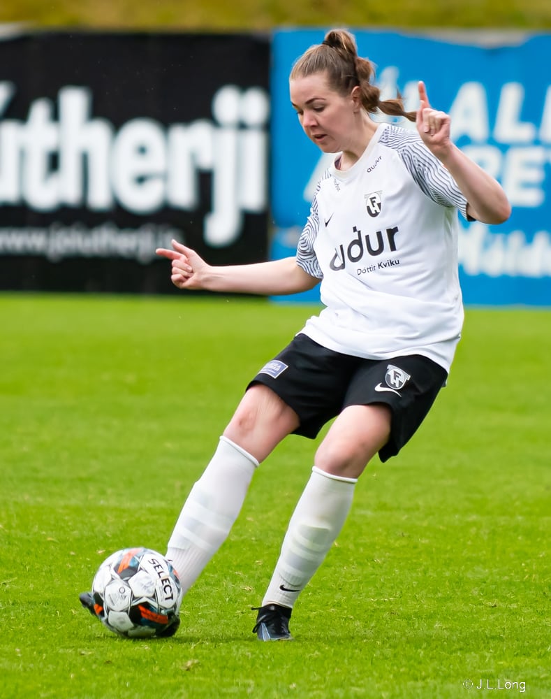 Rannveig með spyrnuna, skot frá Kristin Schnurr í varnarmann, lítil hætta þarna
