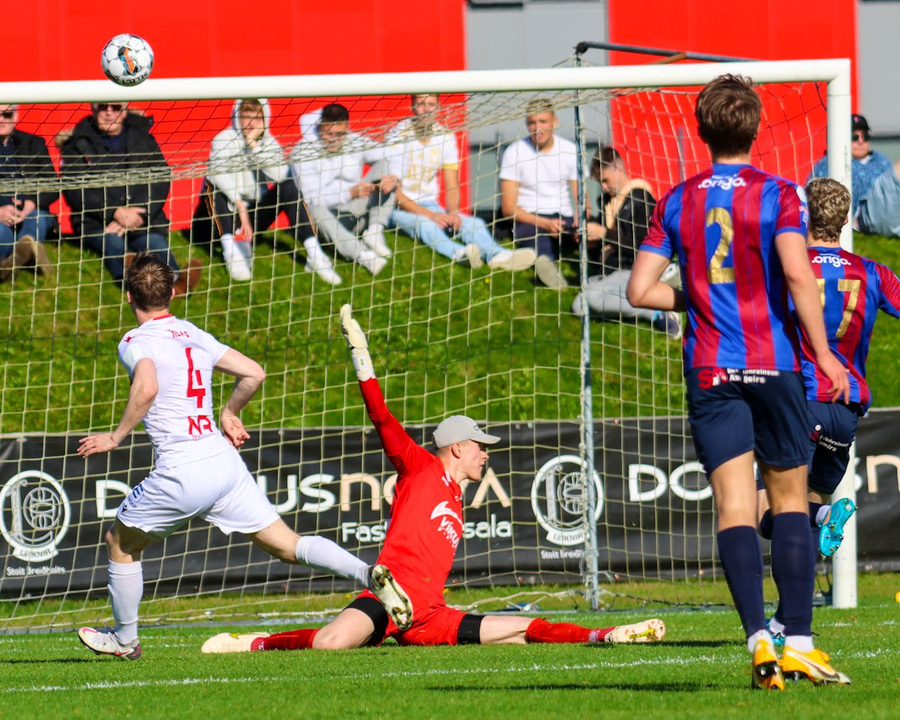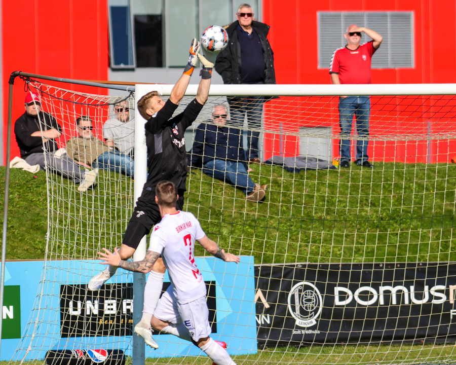 Það eru 377 áhorfendur í Breiðholtinu í dag. Hér er mynd frá Hauki af því þegar Frederic Schram ver áðan.