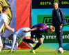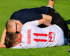 Eftir aðhlynningu sjúkraþjálara er ljóst að Adam er meiddur aftan í læri og þarf að fara af velli.