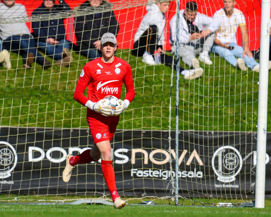 Ágúst Eðvald með skot beint í fangið á Viktori Frey. Þetta er ekki merkilegur fótbolti sem er spilaður í Breiðholtinu í dag.