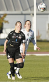Júlíana neglir boltanum fram á Kristínu og hún leggur boltann framhjá Hörpu.