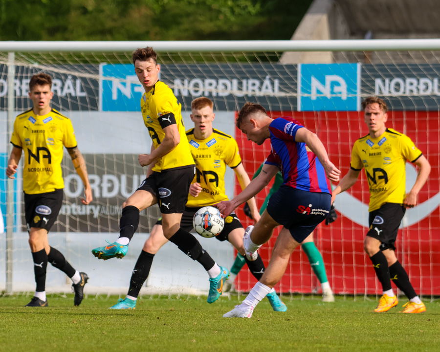 Eyþór Wöhler fær boltann óvænt í þröngu færi og tekur bakfallsspyrnu sem fer rétt yfir markið.