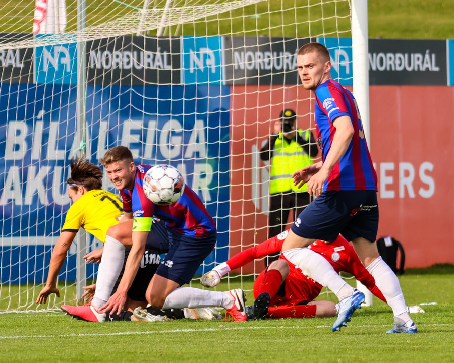 Leiknir tekur hraða aukaspyrnu, koma boltanum á Kristófer sem tekur fyrirgjöf með jörðinni. Tobias er við markteig og reynir að koma boltanum frá en setur hann í eigið net.