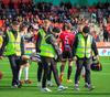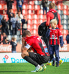 Hallur Hansson liggur á miðjum vellinum og heldur um hnéð. Virðist nokkuð þjáður eftir baráttu við Kyle.