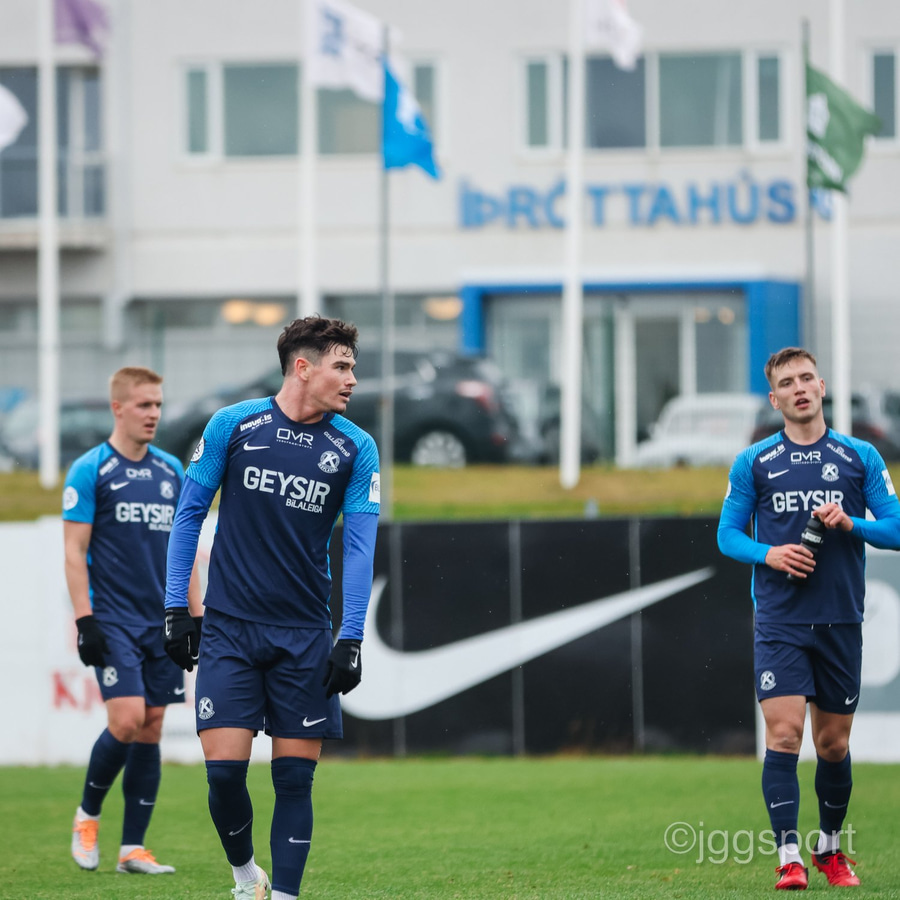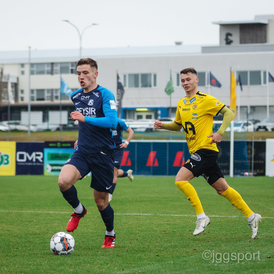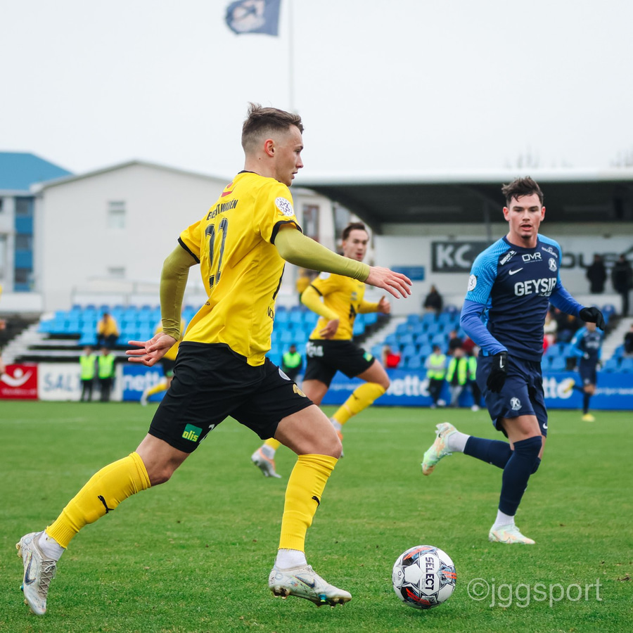 Keflavík sækir, Kian fer vel með boltann vinstra megin í teignum en tekst ekki að finna samherja í teignum. Sýnist það vera Oliver sem kemur boltanum frá.