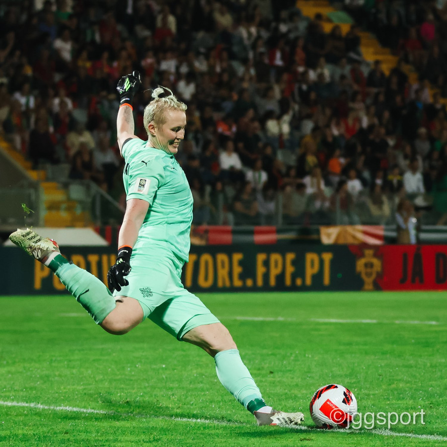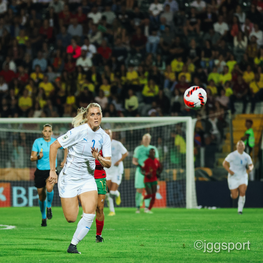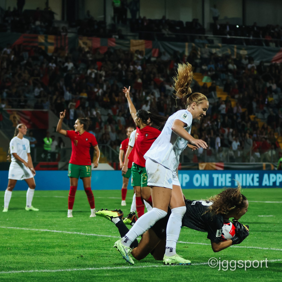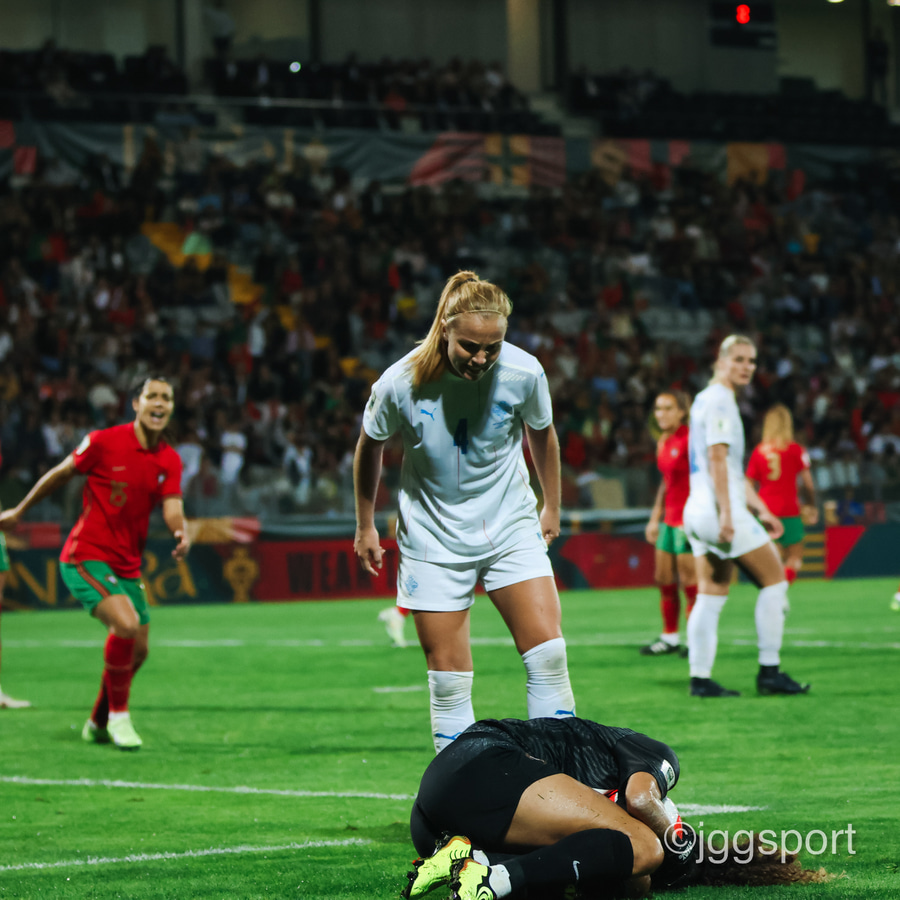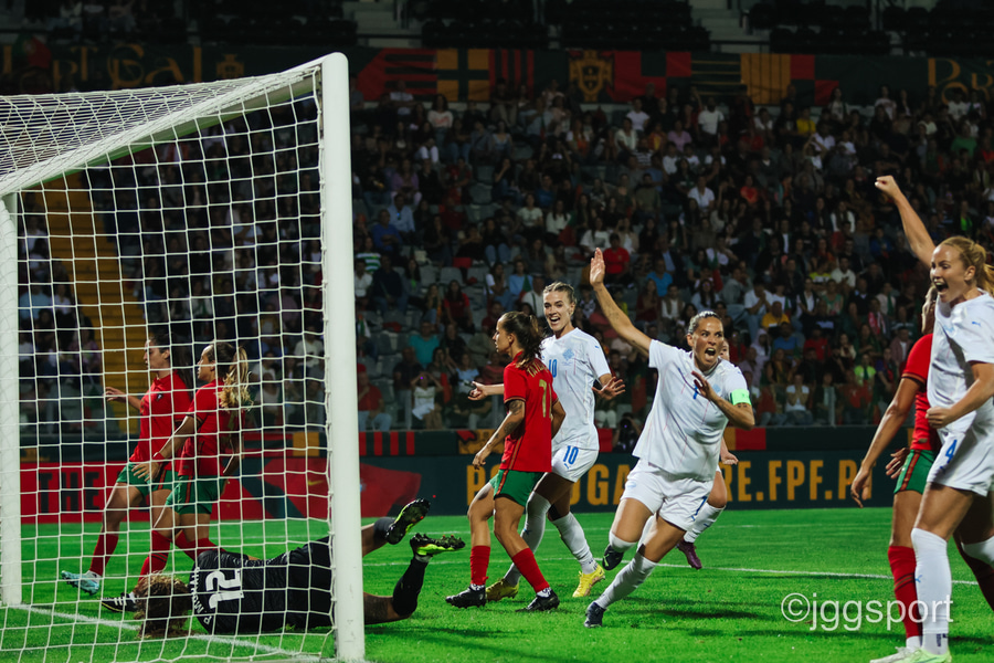 Áslaug Munda með aukaspyrnu inn í teiginn, markvörður Portúgals grípur í tómt og boltinn dettur á Gunnhildi Yrsu í teignum. Hún gerir vel en setur boltann í slána! Þarna munaði rosalega rosalega litlu.