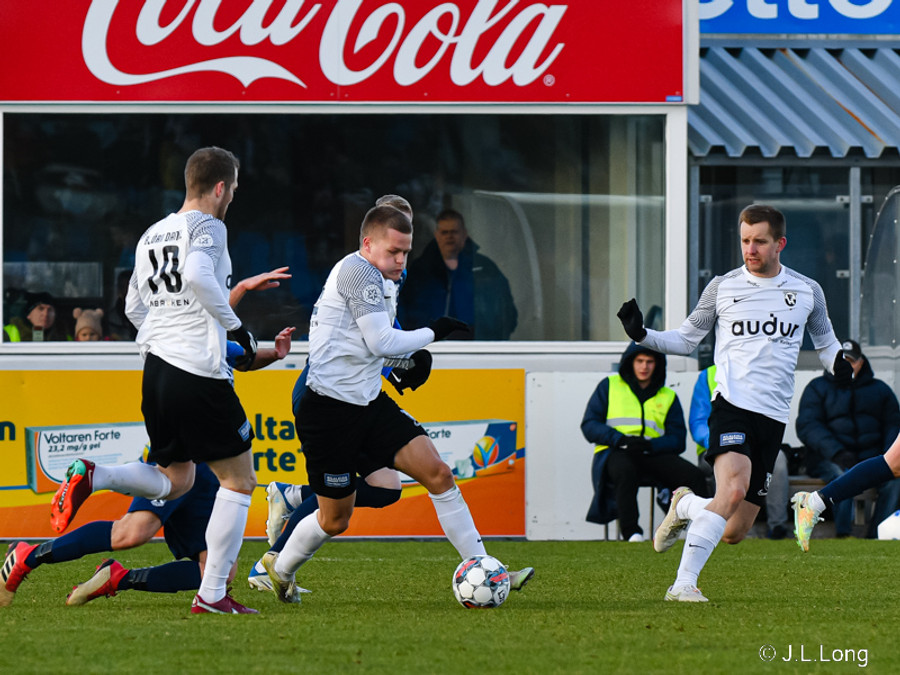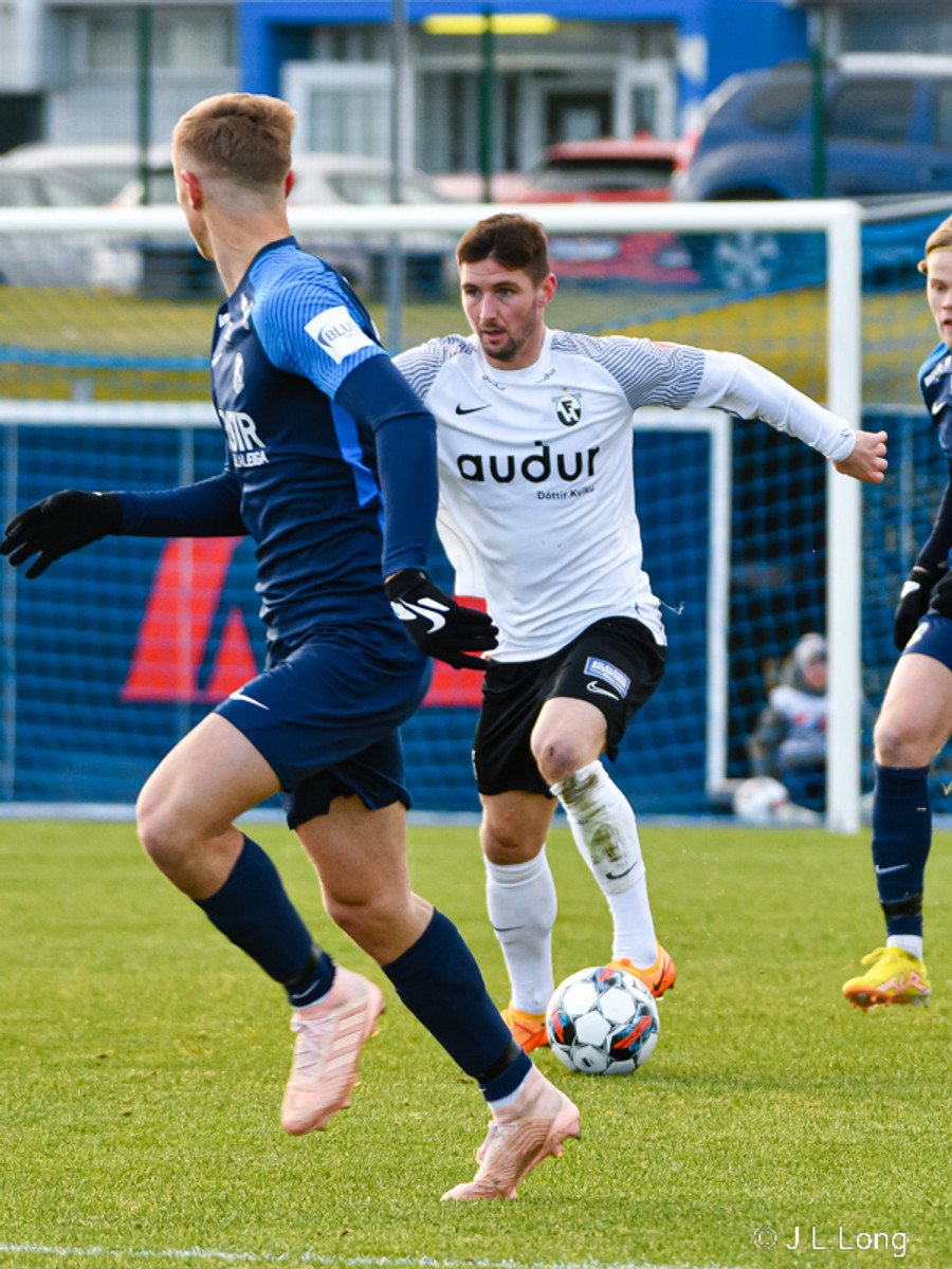 Adam Ægir með boltann fyrir úr þröngri stöðu, Atli hársbreidd frá því að missa boltann undir sig en tekst að bjarga á endanum.