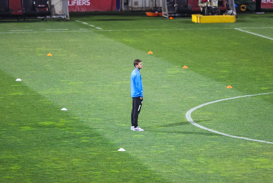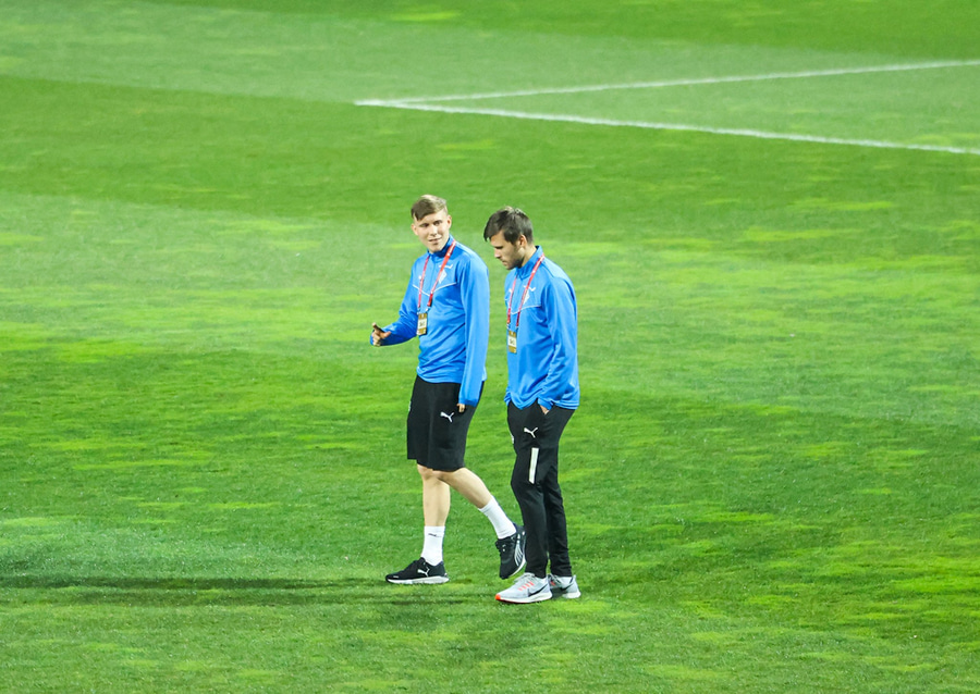 Fékk Magnús Val Böðvarsson, vallarstjóra KR-vallar, til að meta völlinn í Zenica útfrá þessari mynd sem ég var að taka.