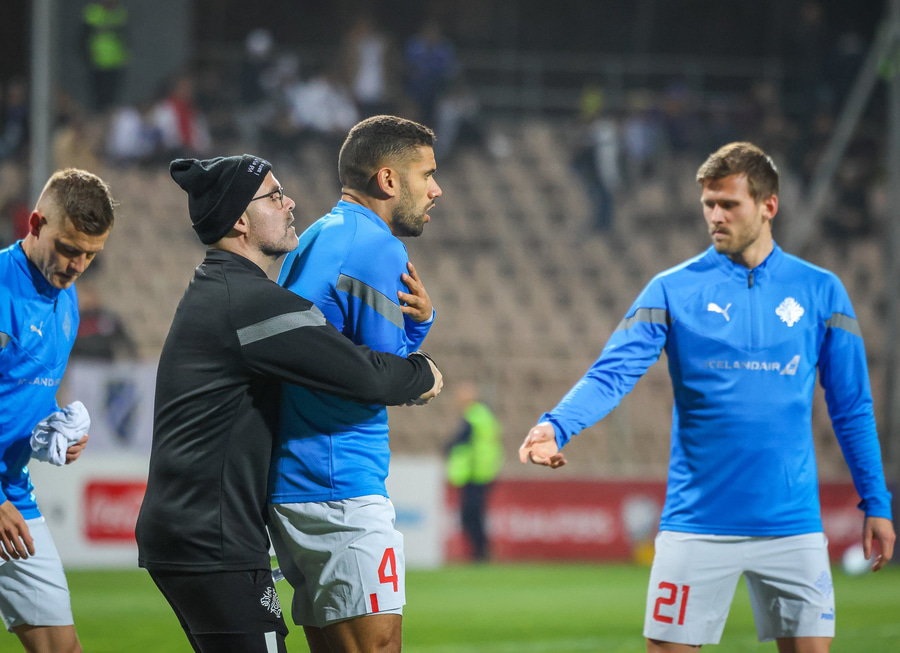 „Ég er kominn hingað til að hjálpa til við að undirbúa liðið eins vel og hægt er. Það er svekkjandi að vera ekki með. En ég mæti ferskur í Liechtenstein leikinn, maður reynir að horfa á þetta jákvæðum augum."