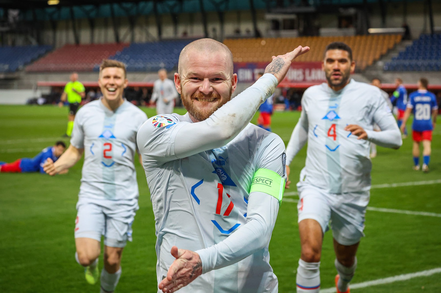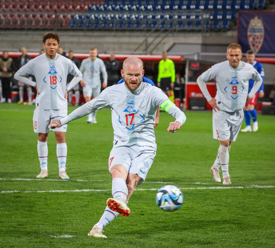 Aron Einar með þrennu í þessum leik. Afar öruggur á vítapunktinum. Hann var búinn að skora tvö landsliðsmörk í 100 landsleikjum fyrir þennan leik.