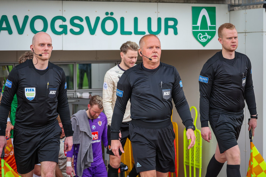 Erlendur Eiríksson heldur um flautuna á Kópavogsvelli í kvöld. Honum til halds og trausts eru þeir Andri Vigfússon og Ragnar Þór Bender. Vilhjálmur Alvar Þórarinsson er fjórði dómari og efirlitsmaður KSÍ er Jón Sigurjónsson.