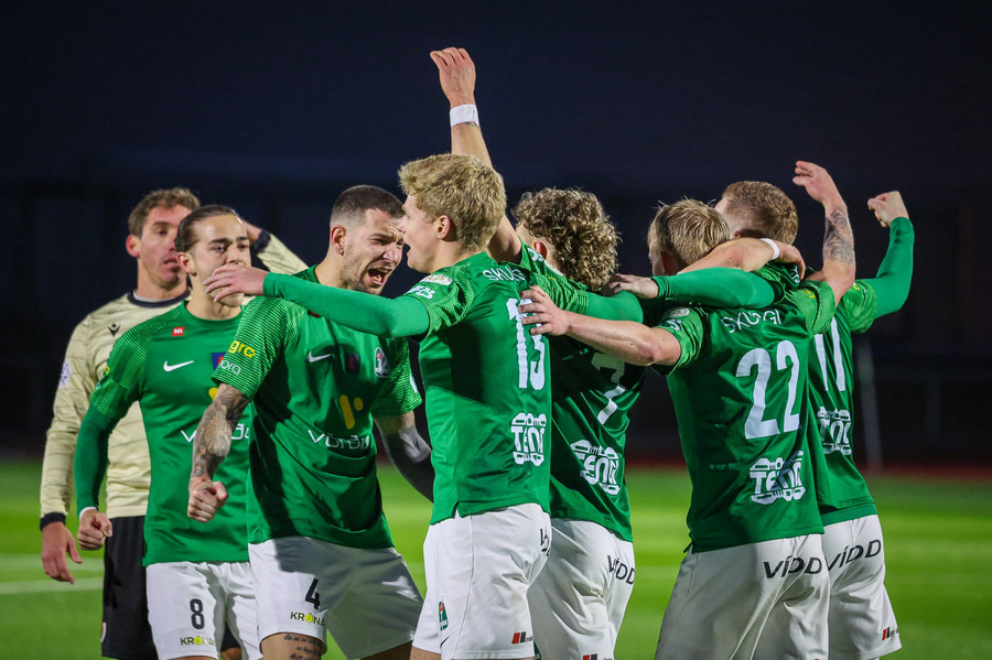 Ágúst Eðvald vinnur skallaboltann við Karl Friðleif og skallar boltann til Patriks sem skallar hann niður í teiginn fyrir Gísla sem skorar með snyrtilegu skoti frá vítapunkti.