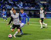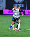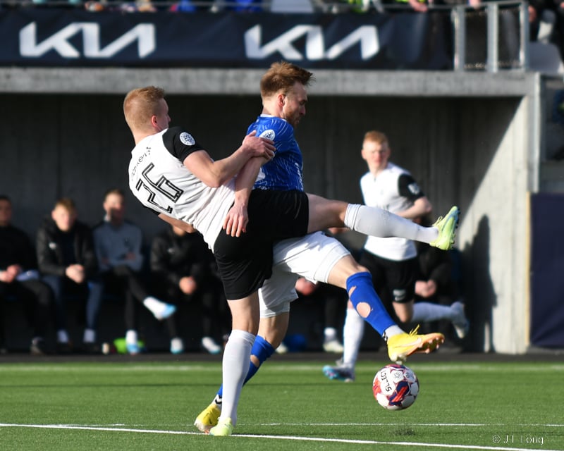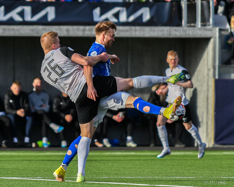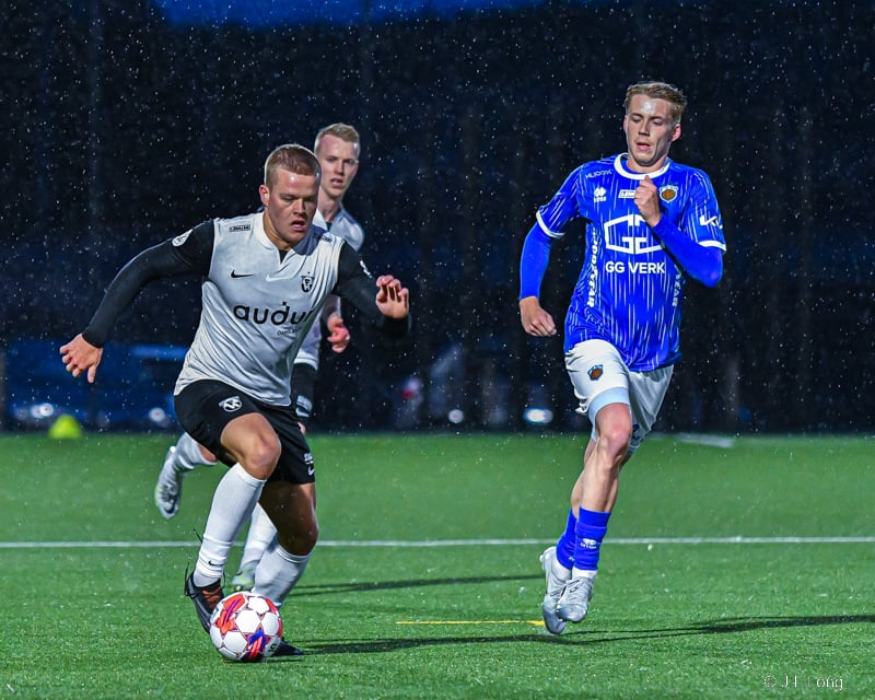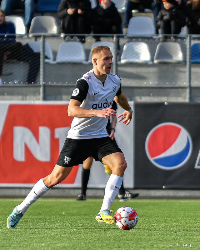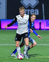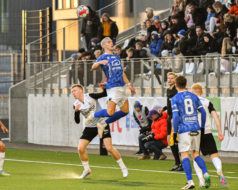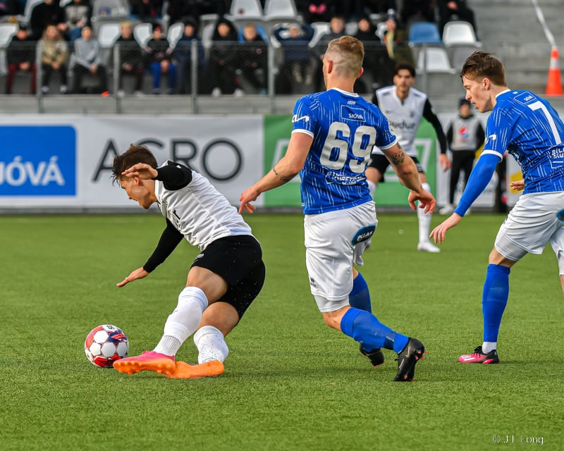 Albert Hafsteins fær boltann úti við hliðarlínu og Dani Hatakka keyrir hann niður