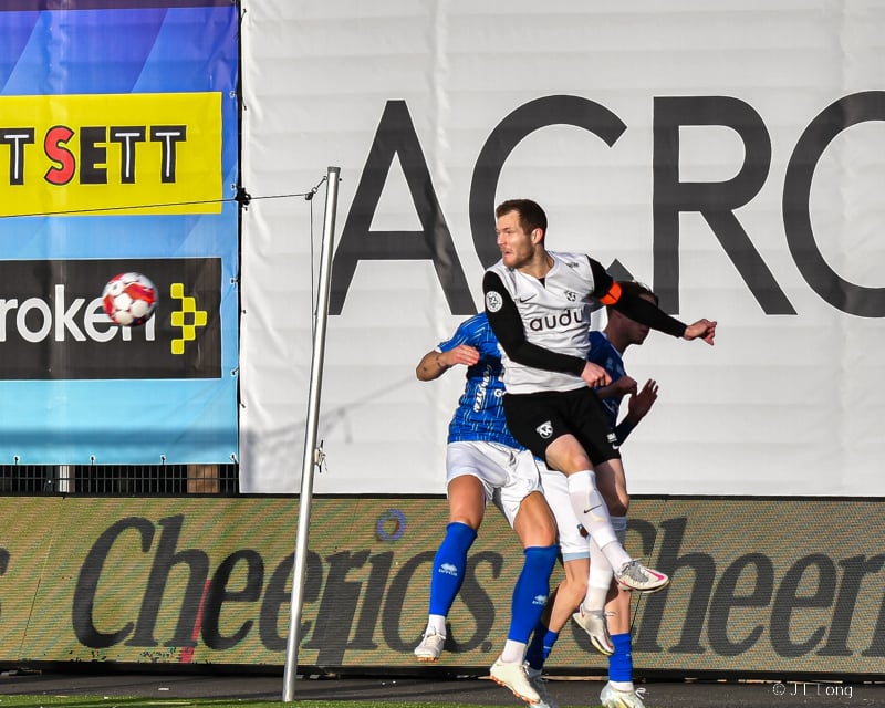 Úlfur Ágúst fær boltann fyrir utan teig og á skot sem fer af varnarmanni og í hornspyrnu.