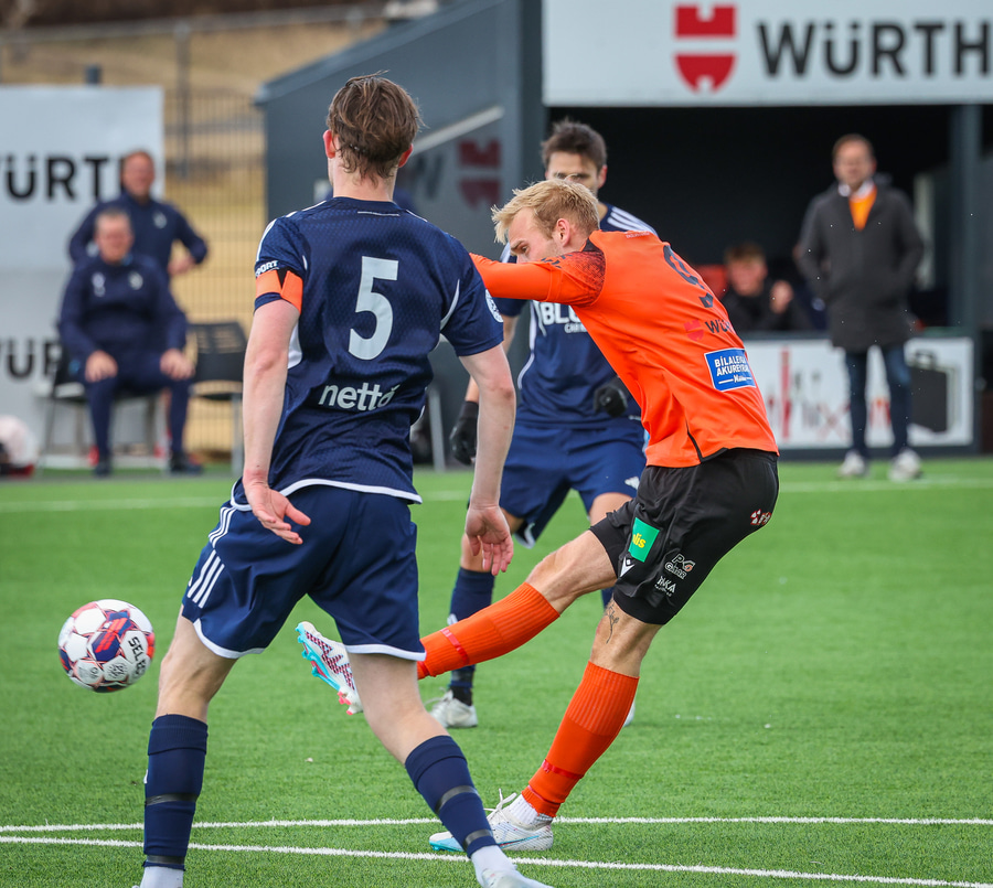 Dagur Ingi Valsson með skot sem dempast af varnarmanni og endar svo í höndum Ólafs Kristófers.