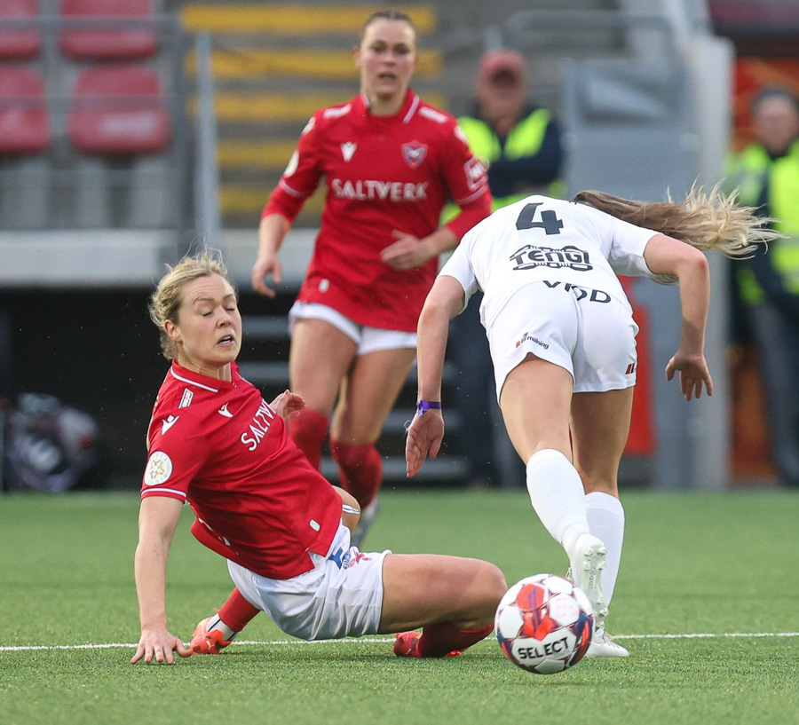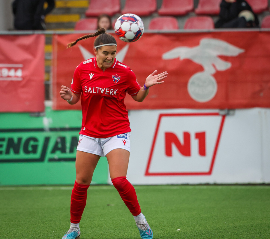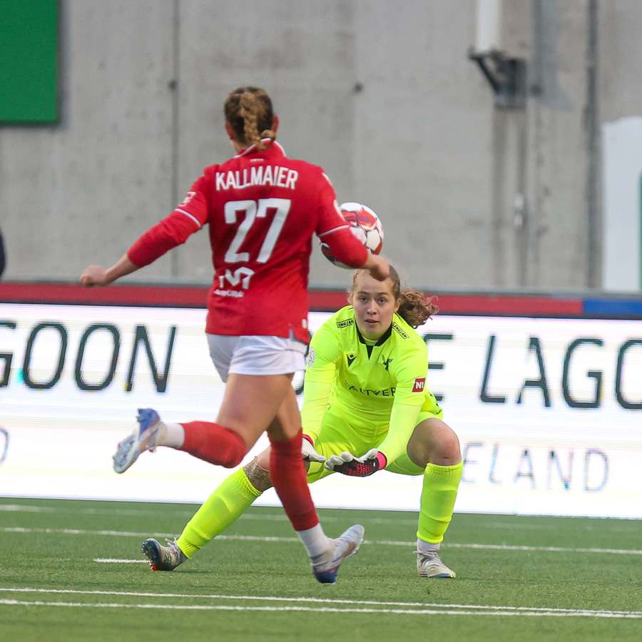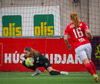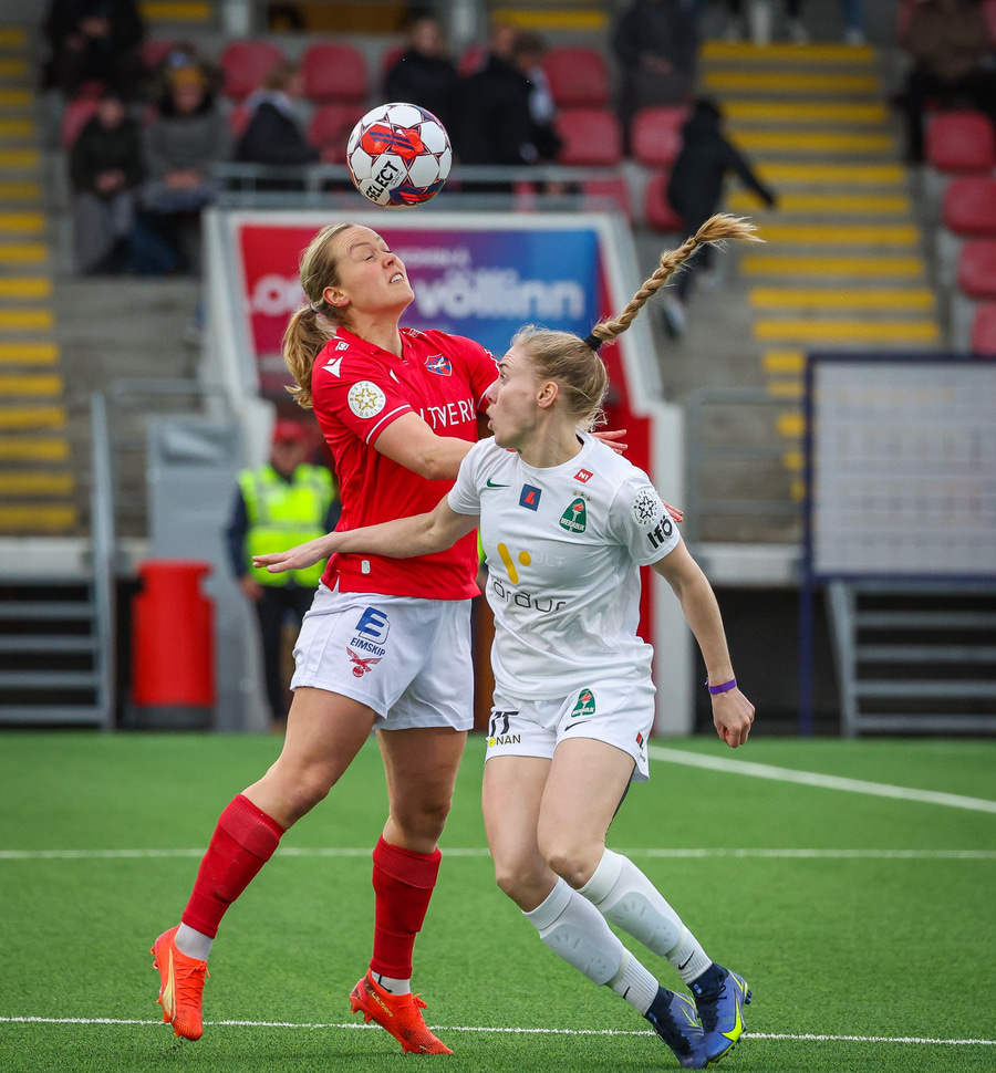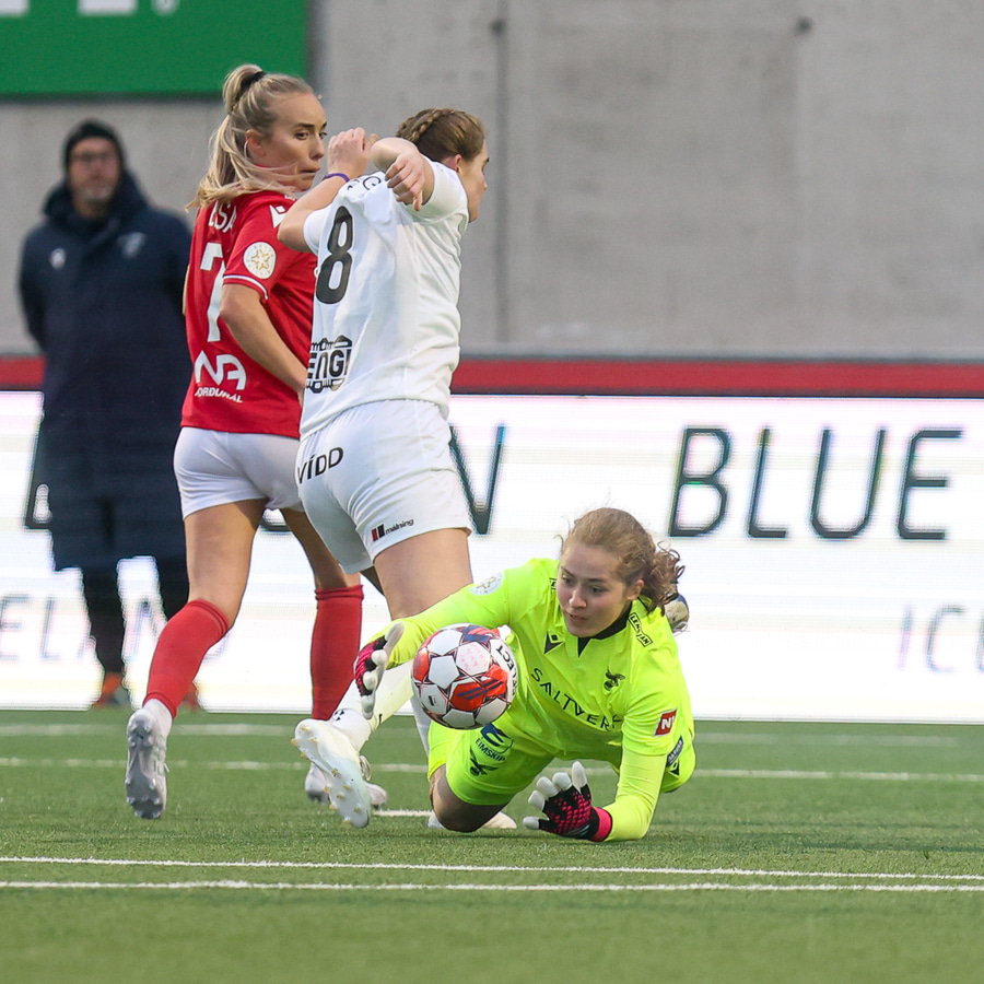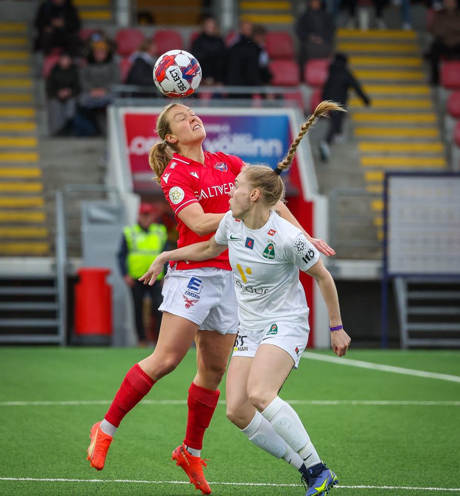 Fyrirgjöf fyrir mark Vals þar sem Agla María nær fríum skalla en beint á Fanney Ingu!