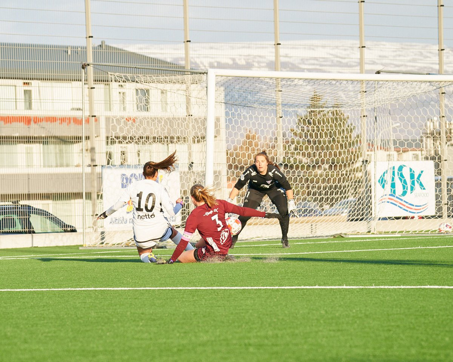 Dröfn kemst inn fyrir, Bryndís tæklar en Dröfn nær skotinu.