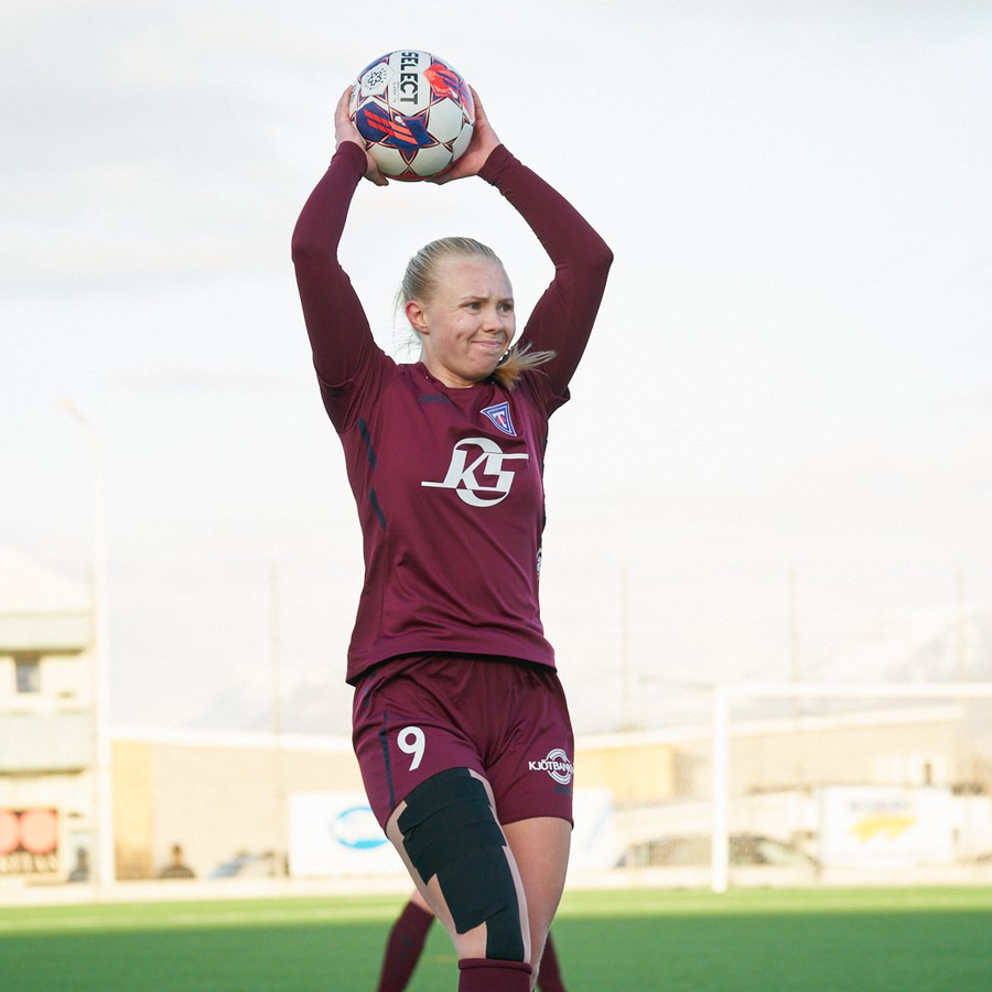 Sandra kemur með góða spyrnu sem lendir beint fyrir framan Mikaelu sem skýtur yfir