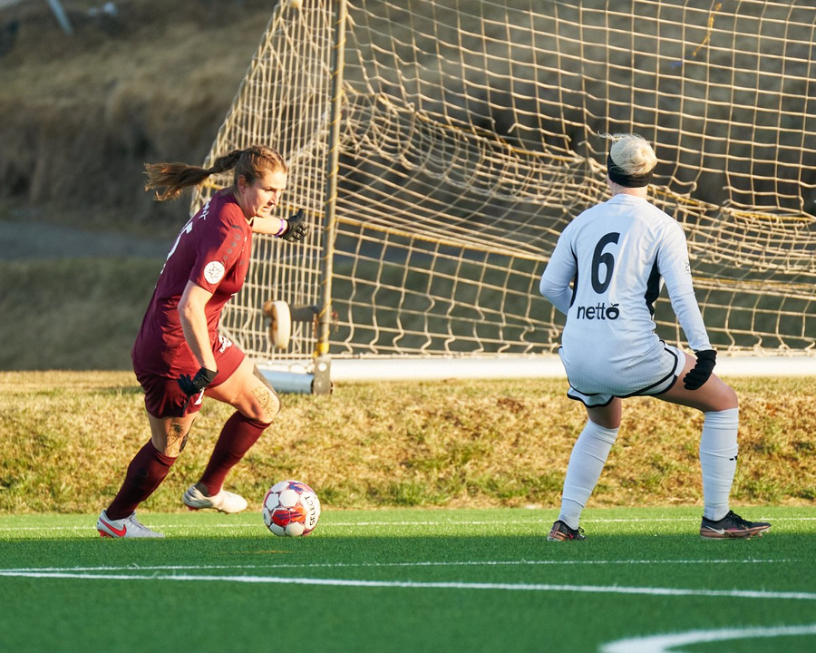 Dröfn kemst með boltann inn en Gwen verst vel og kemur boltanum í burtu