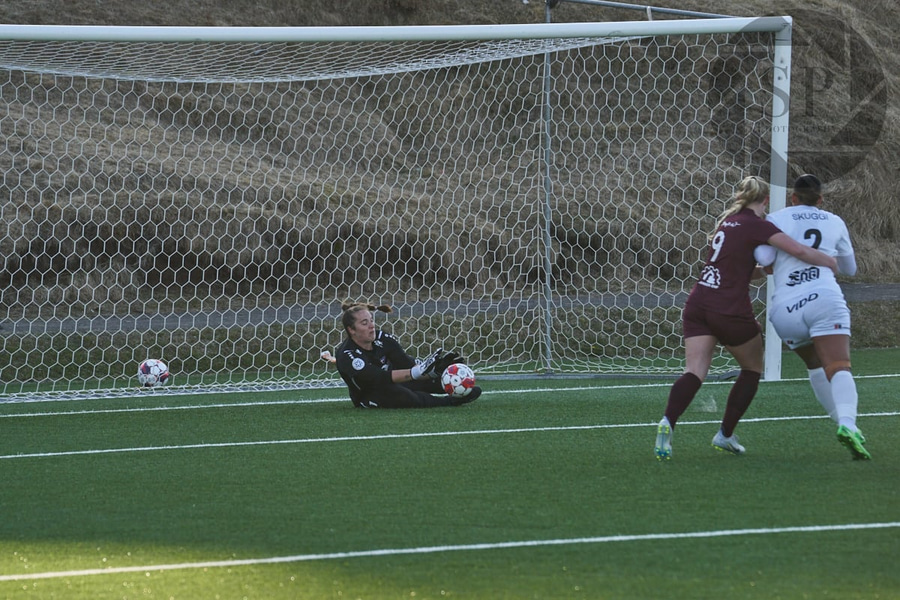 Hugrún með góða stungu á Mur sem nær fínu skoti en Telma ver vel í markinu