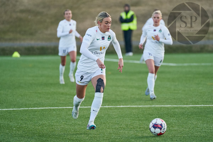Elín með langa sendingu á Vigdísi upp kantinn sem sendir á BLika sem tekur skotið en það fer vel framhjá
