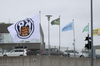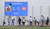 Liðin ganga inn á völlinn, KR í hefðbundnu svörtu og hvítu. HK er í nýju Sampdoria búningunum.